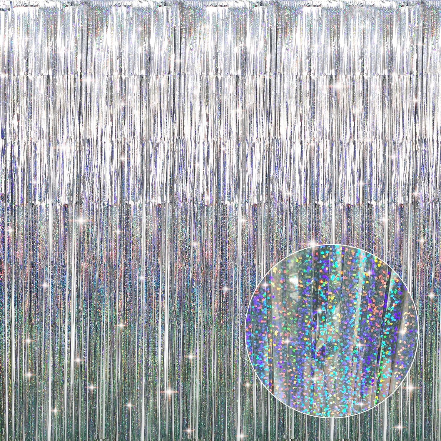 - Package Includes:1 pack shiny silver foil fringe curtain,3.2 ft x9.8 ft each,suitable for hanging on a door or coverage a wall fully