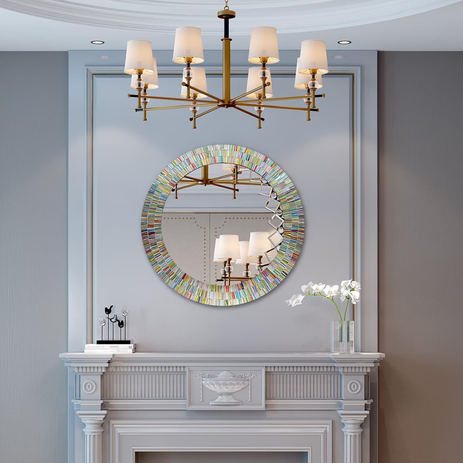 Bohemian Rainbow Wall Mirror -Glass Mosaic Mirror Decorative Wall Mirror, Multi Color Spectrum Wall Mountable, 24" Multi-Color Round Framed Mirror