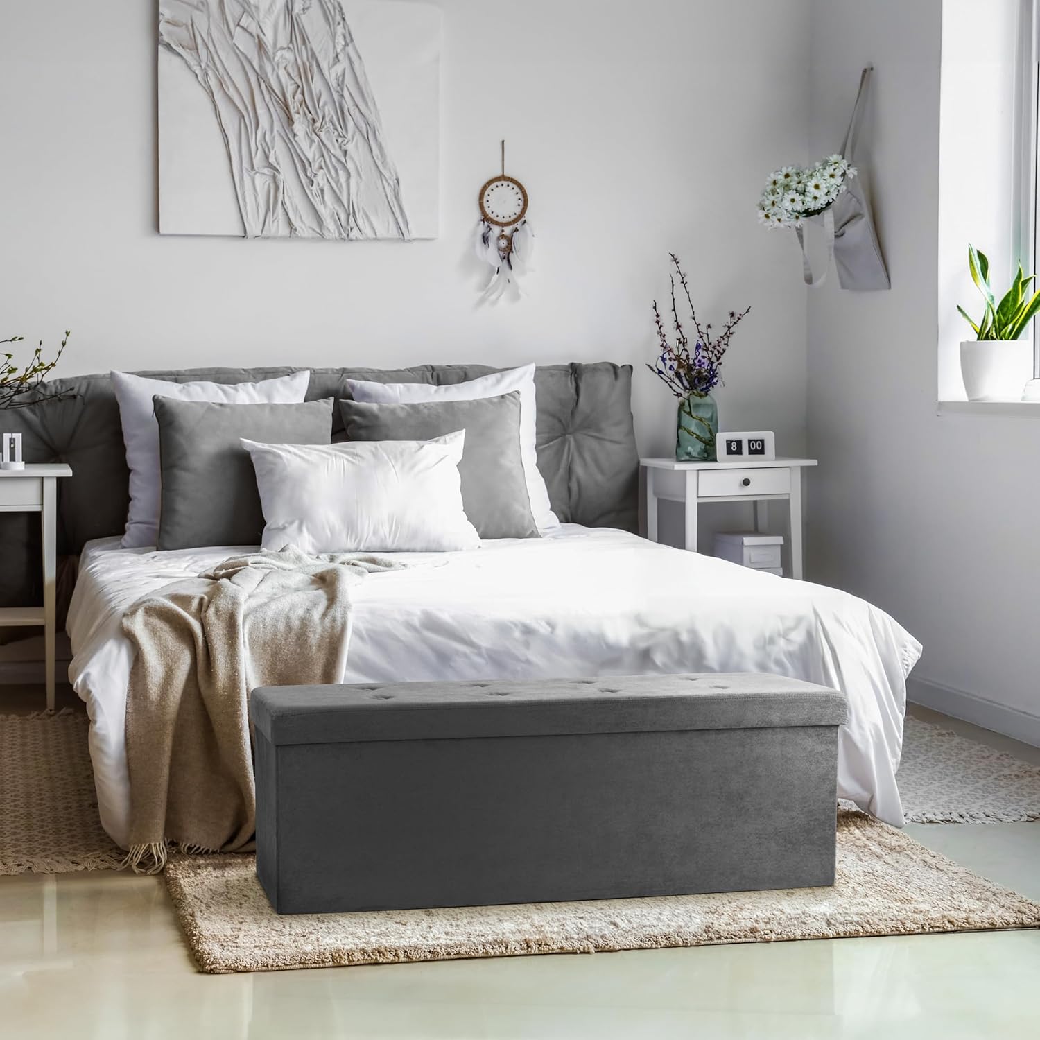- LARGE SUEDE STORAGE BENCH (GRAY) — Add storage and seating with a beautiful rectangular shaped folding bench, perfect for storing a variety of items— Tuck away linens, games, books, blankets, accessories, and more to maximize your space with contemporary style