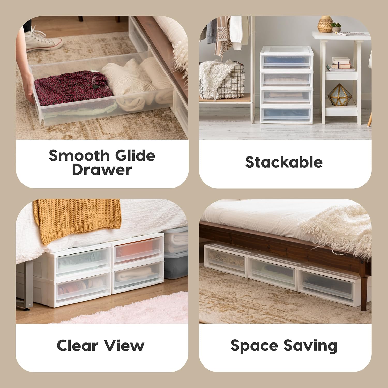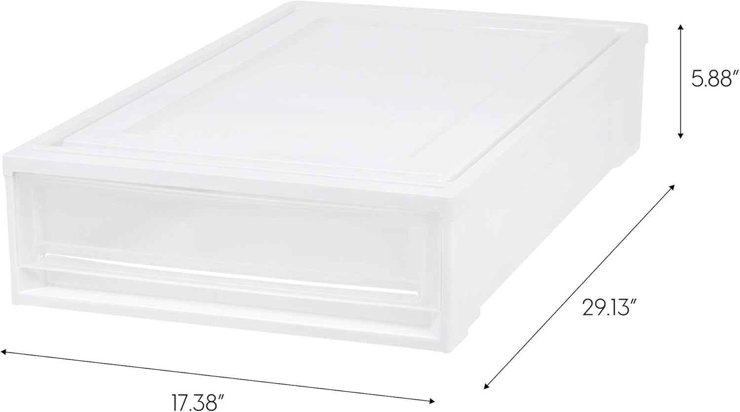 IRIS USA 27 Qt. Plastic Under Bed Storage Stackable Organizer Bin Container with Sliding Organizer Drawers, 4-Pack, Multi-Purpose for Clothes Shoes Clothing Bedding, White
