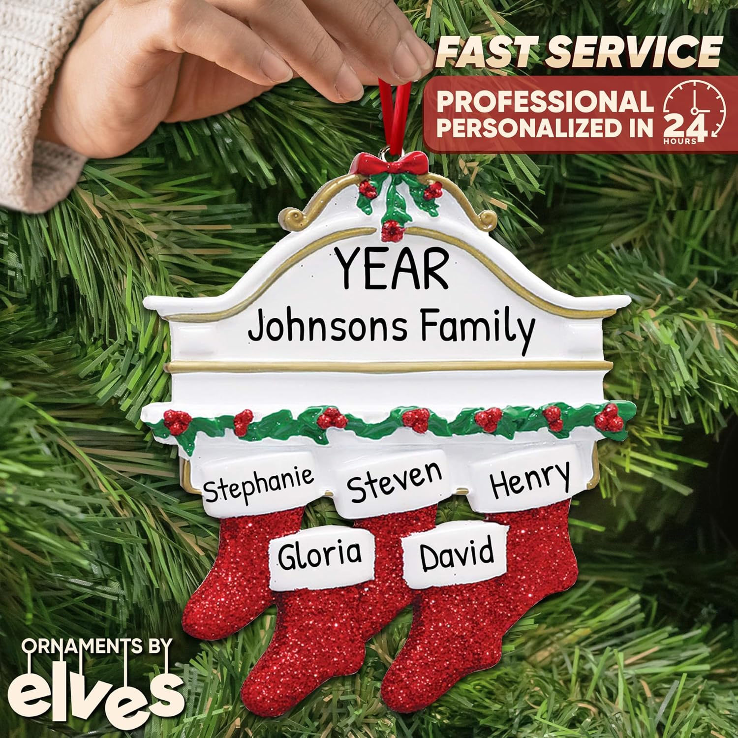 - 🎁 Celebrate Your Family of 5: Mark a joyful milestone with a personalized family of 5 Christmas ornament 2025. Whether it’s your first year as five or part of a cherished tradition, this keepsake honors your growing bond and tells your story with warmth, love, and festive cheer. This white and gold Christmas mantel features four red glitter stockings, a green holly garland with berries, a red bow holiday accent, and a blank space for family names to personalize your festive display.
