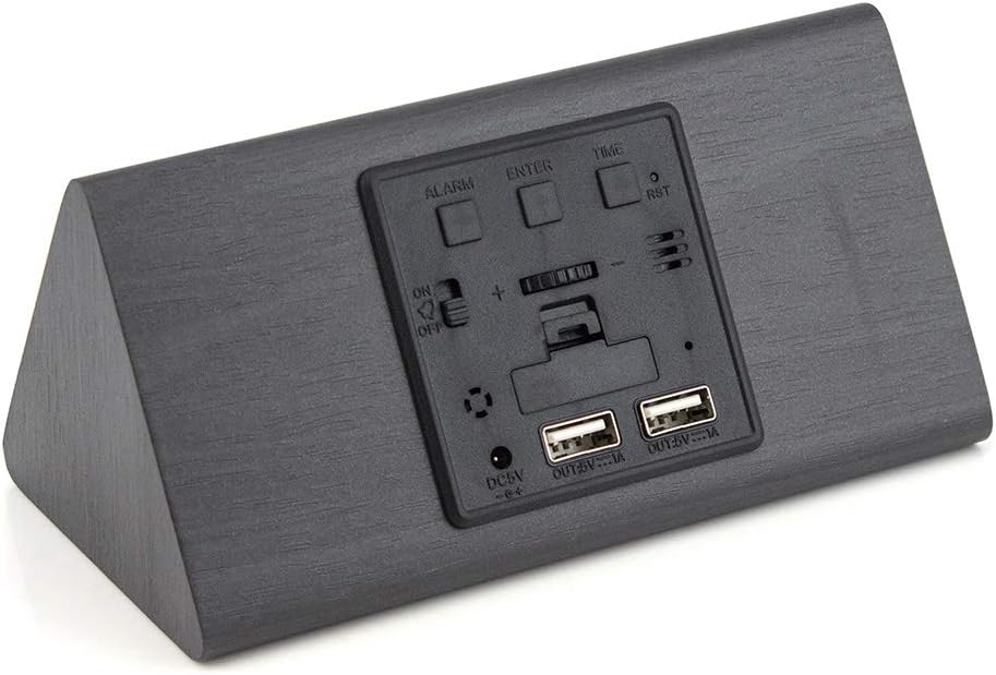 - MODERN & CONVENIENT DESIGN: Designed for simplicity and elegance. Made with premium quality black MDF medium density fiberboard material and white LED backlight display, this wooden alarm clock can perfectly fit in any modern designed home or office furniture. Portable and compact design, size approx. L6 x W3 x H3 inch. This minimalist multifunctional clock would be a great addition to any room.