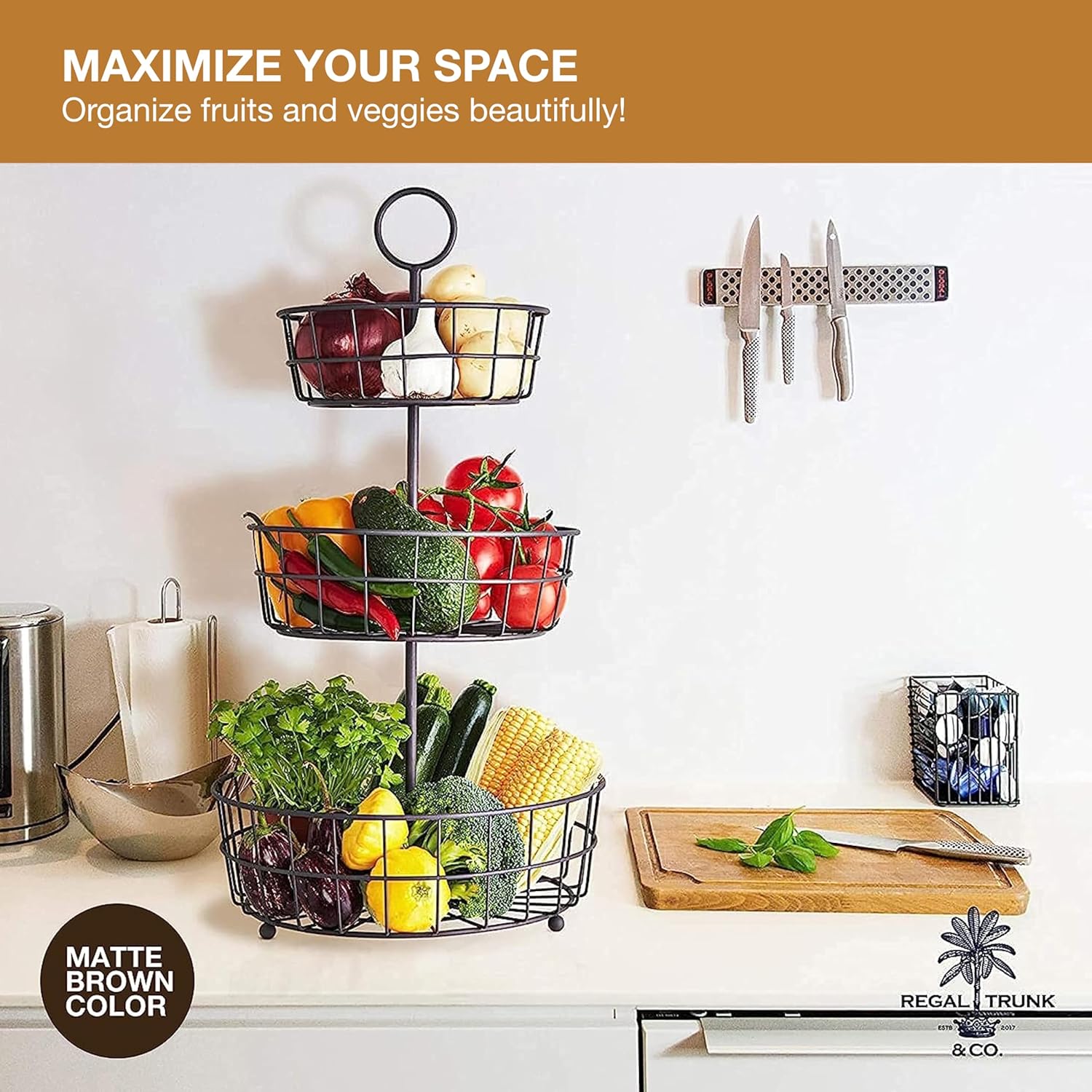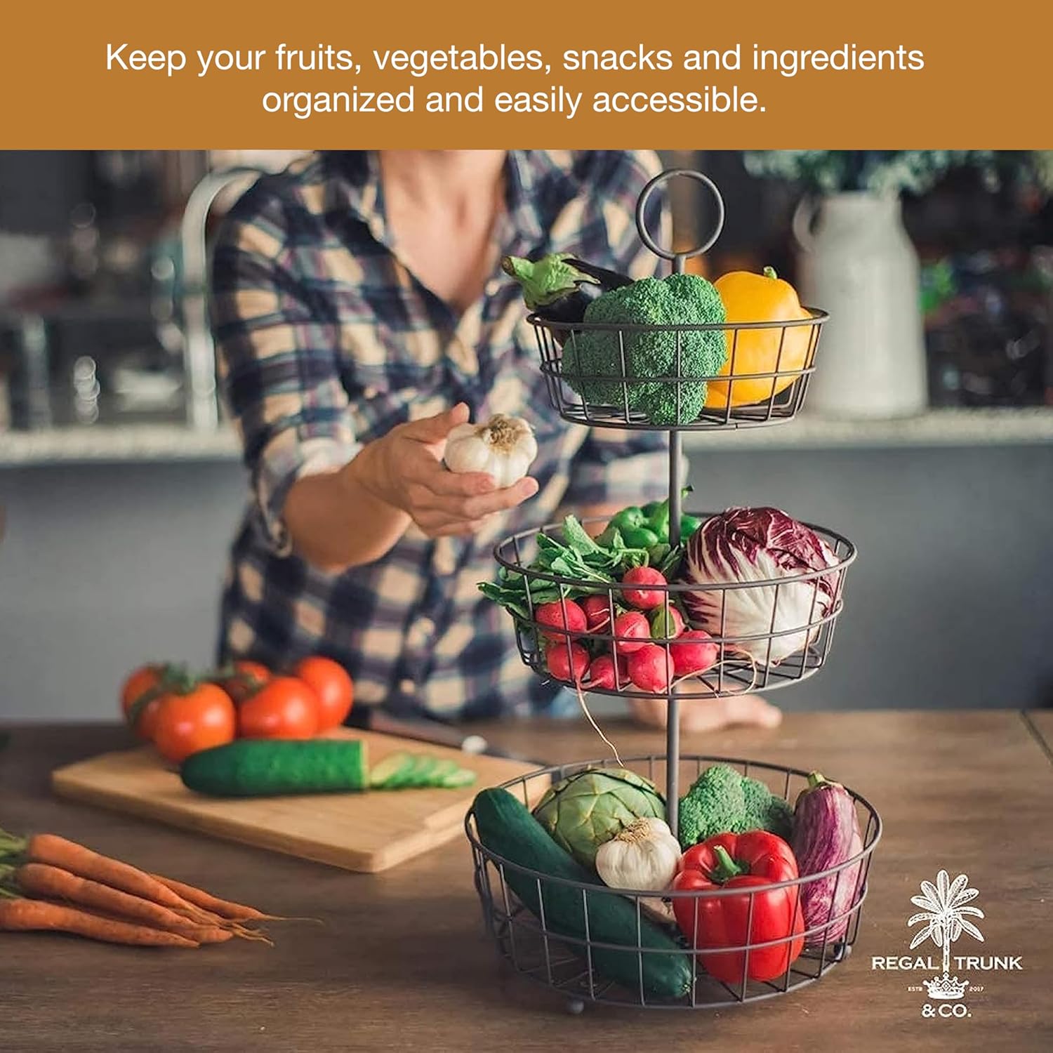 REGAL TRUNK & CO. 3 Tier Fruit Basket, Elegant French Country Wire Baskets, Three Tiered Wire Basket Stand for Vegetables, Bread & More for Countertop or Hanging, Christmas or Birthday Present