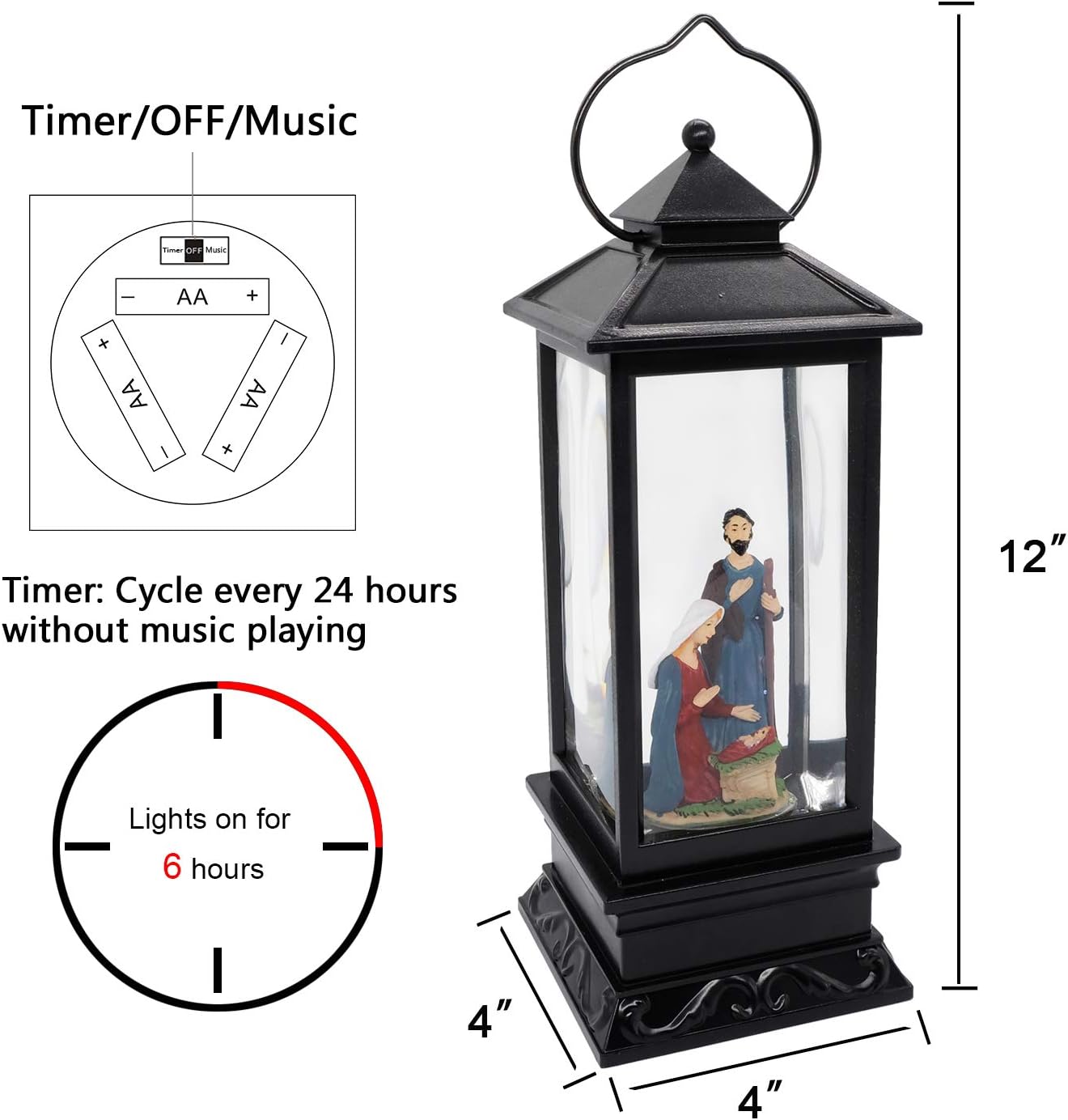 Eldnacele Musical Snow Globe Lantern Lighted Lamp USB Lined in Swirling Glitter Water Lantern Lamp Christmas Nativity Decoration Hurrican Light Timer 12" (Nativity)