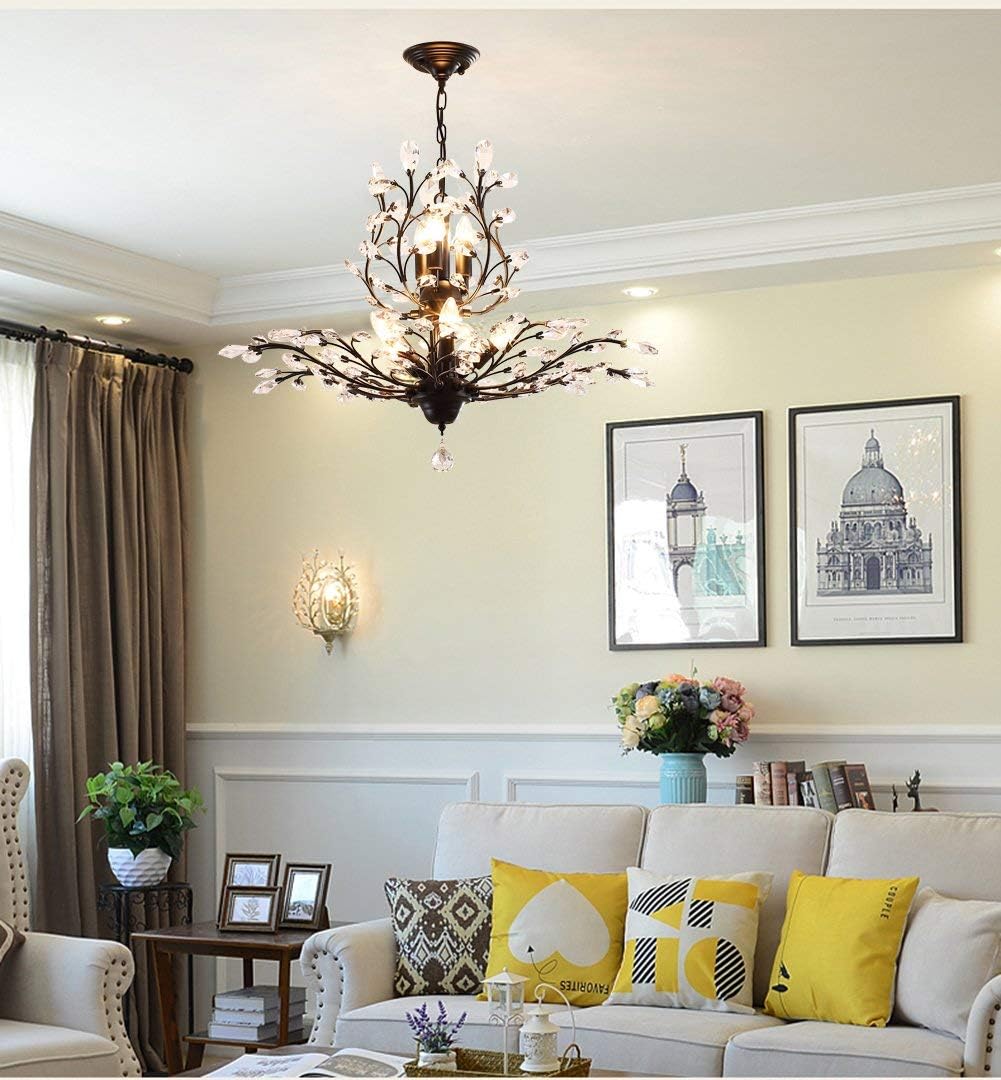 - ARTIST DESIGN: This vintage & modern crystal chandelier is beautifully decorated. Use transparent glass crystals to capture and reflect the light of the bulb. This chandelier light fixture can create a perfect atmosphere wherever it is placed! Push button switch, Paint Process, Stable performance, Long service life.