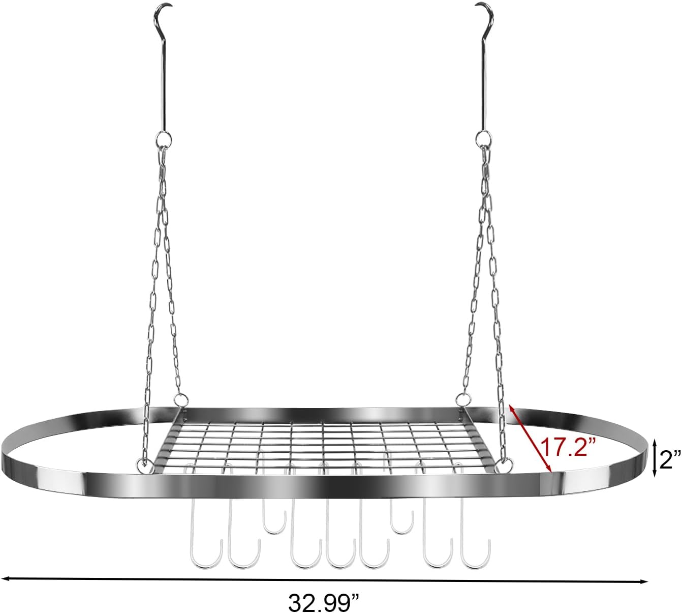 - EASY TO ASSEMBLE — Minimal assembly required with quick set-up — Package includes grid rack with 2 hanging chains, 10 pot hooks, and mounting hardware — Made of metal with powder-coated finish — Beautiful oval frame for stylish look — Complements most light fixtures, appliances, cookware, and design interiors — Measures approximately 31.50" L X 16.50" W X 21" H