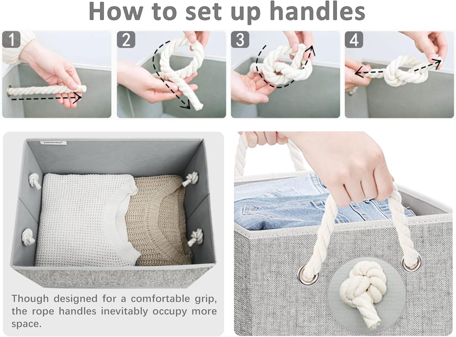 - Closet baskets feature two soft rope handles for comfortable grasping and easy carrying.