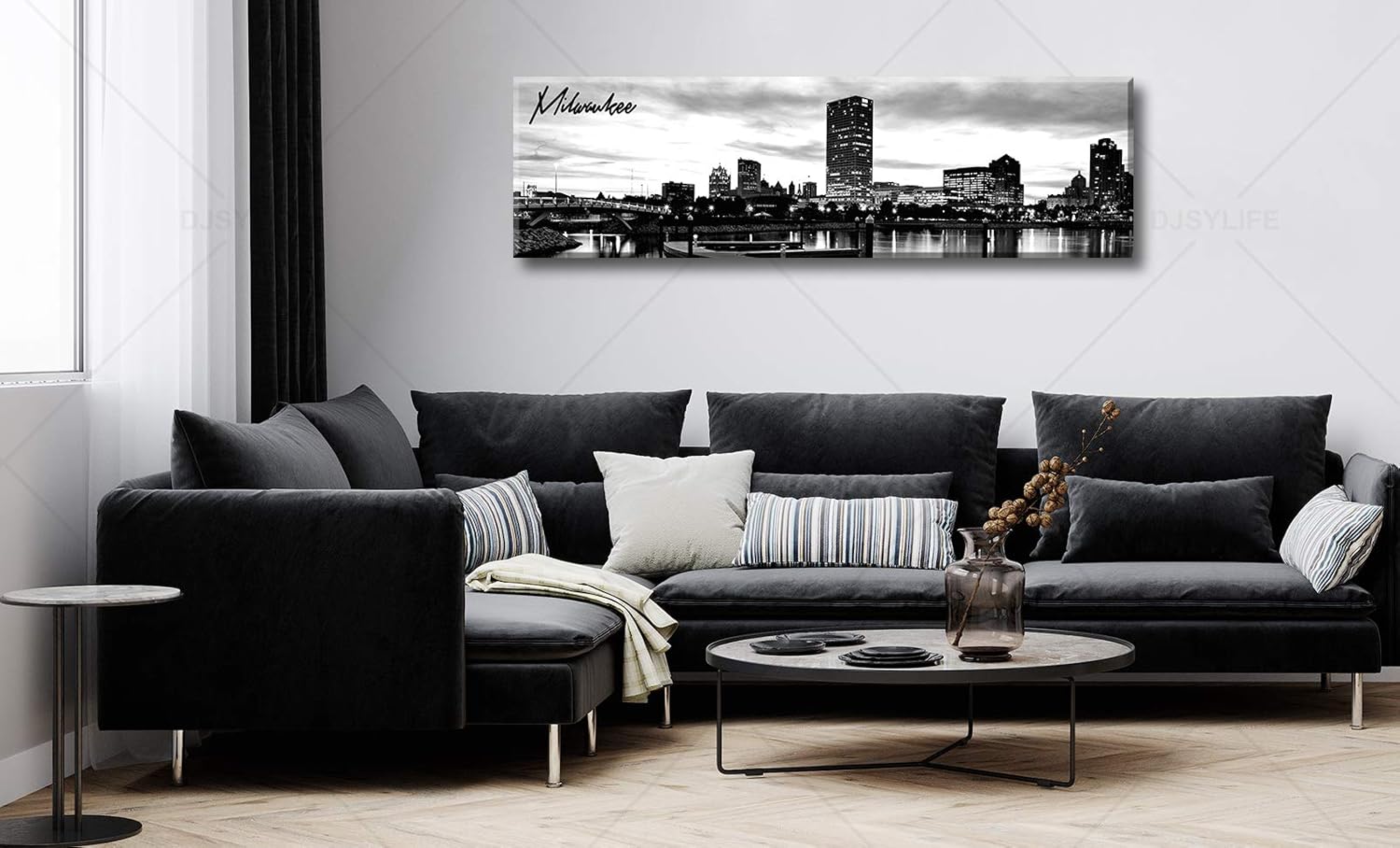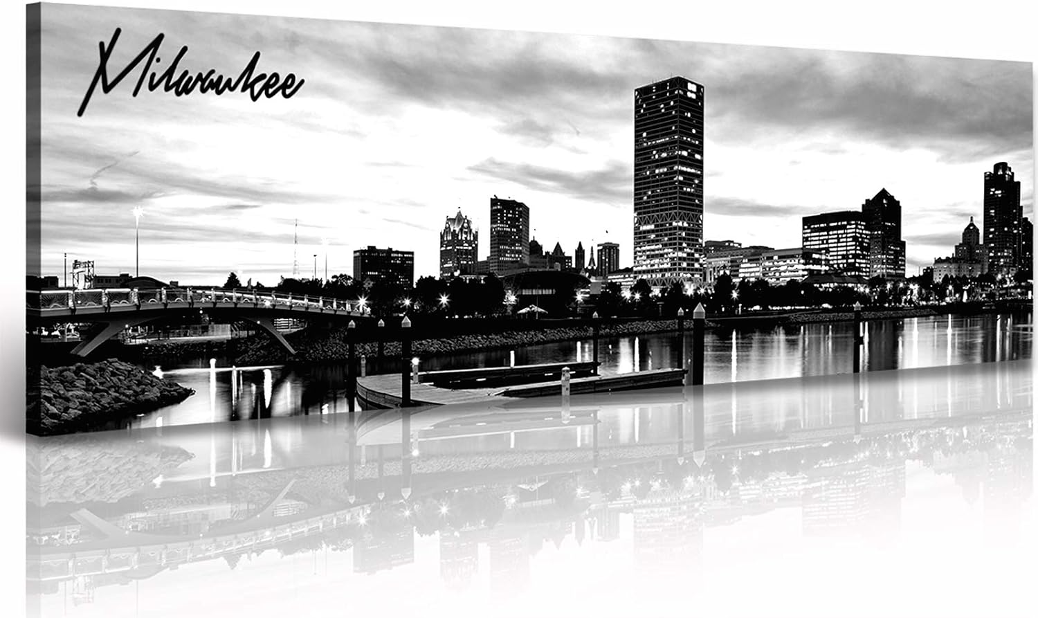 DJSYLIFE Milwaukee Skyline Wall Art Black and White Stretched Canvas Wall Art Prints for Bedroom or Office Decoration Ready to Hang 13.8" x 47.3"
