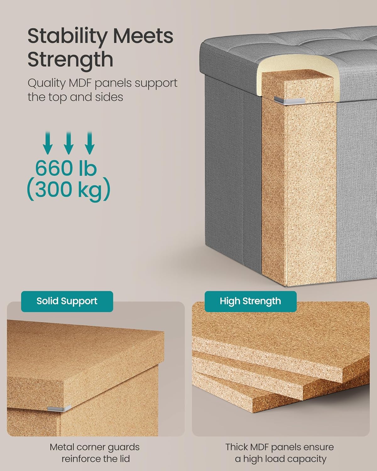 - 【STURDY AND DURABLE】Built with premium MDF panels and reinforced with metal corner guards on the lid, this ottoman is strong enough to support up to 660 lb (300 kg), making it a reliable seating or storage solution that will stand the test of time