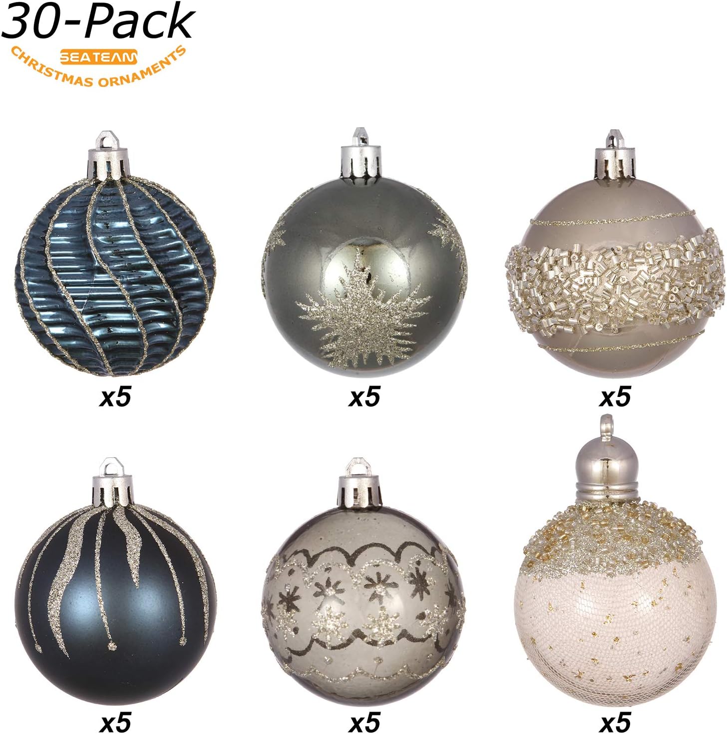 Sea Team 60mm/2.36" Delicate Contrast Color Theme Painting & Glittering Christmas Tree Pendants Decorative Hanging Christmas Baubles Balls Ornaments Set - (Stone Blue & Silver Grey), Pack of 30