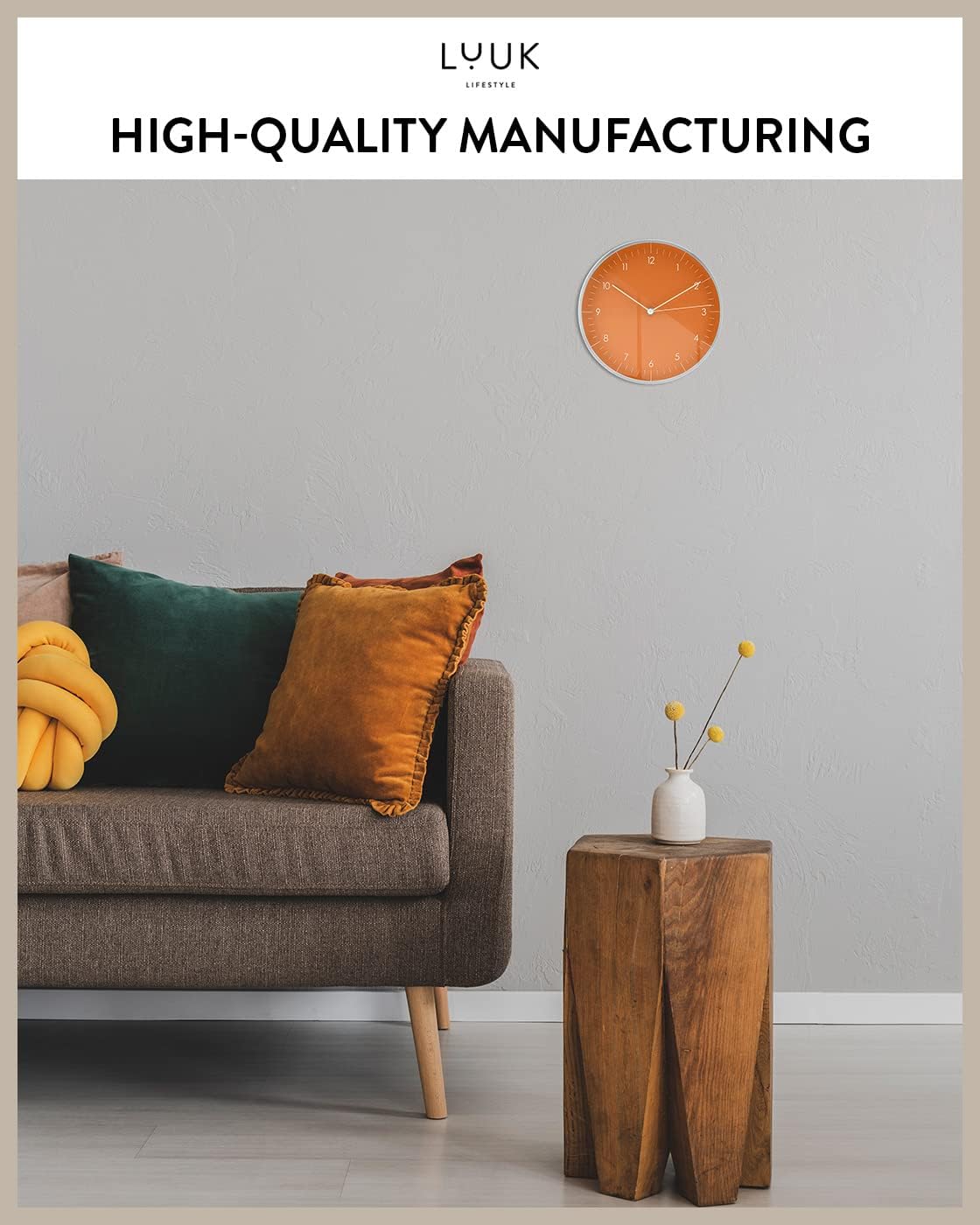 LUUK LIFESTYLE Silent Quartz Wall Clock, Modern and Minimalist Design, Without Ticking, 10” Kitchen Clock, for Living Room, Bedroom, Housewarming Gift, Orange and Silver