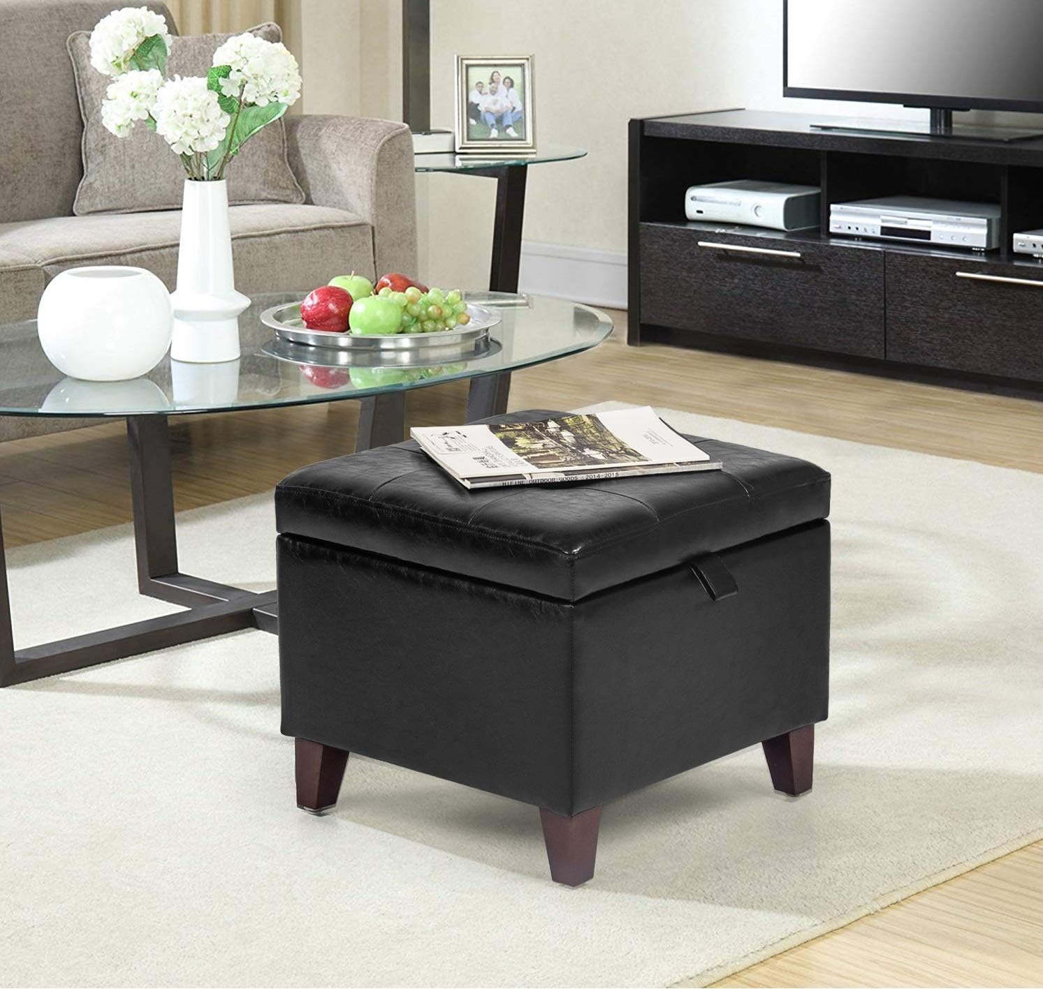 Adeco Storage Ottoman Foot Rest Stool, Leather Ottoman Footstool with Solid Wood Legs and Hinged Lid, 17.7" Small Foot Stool for Living Room, Bedroom