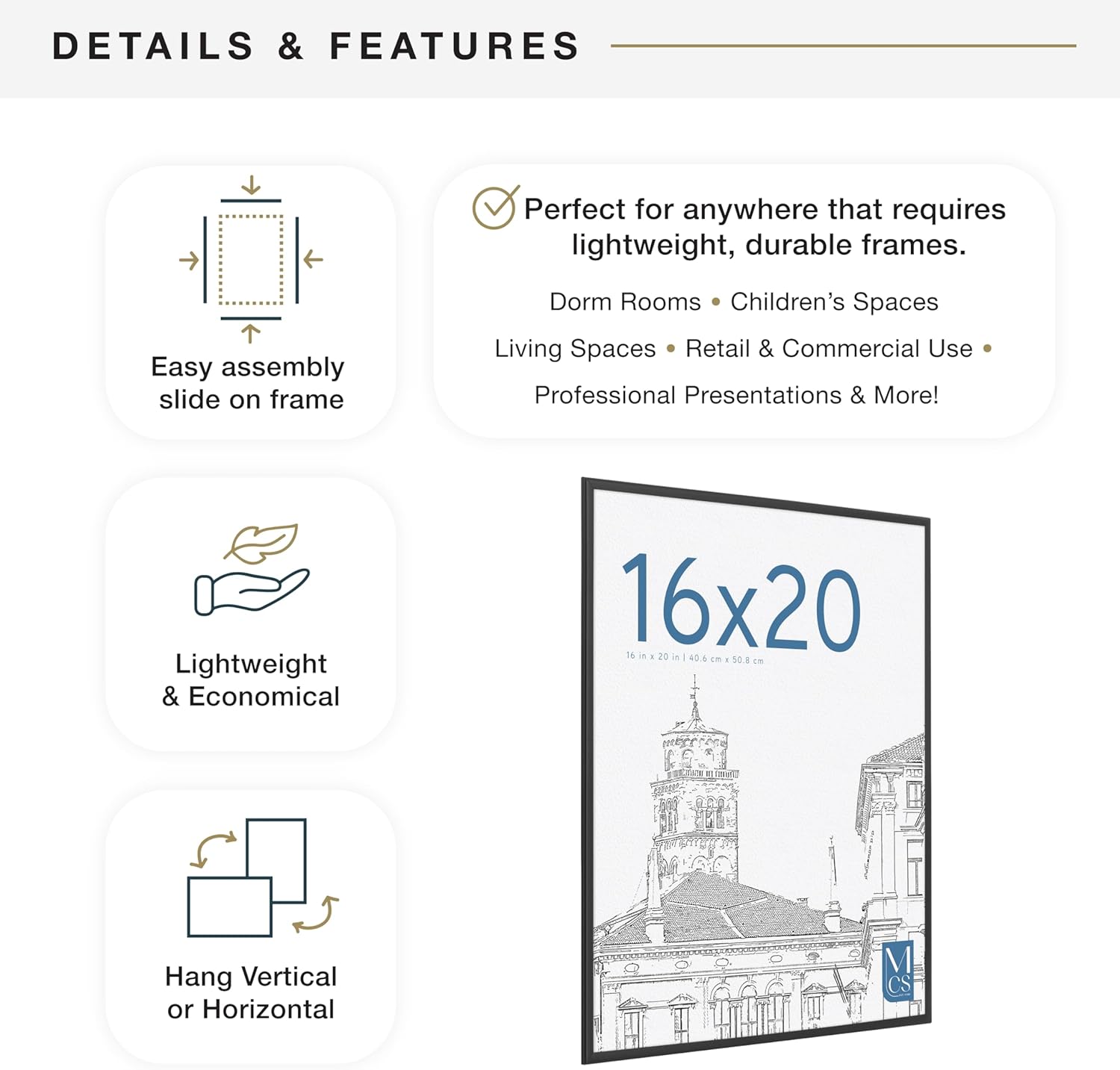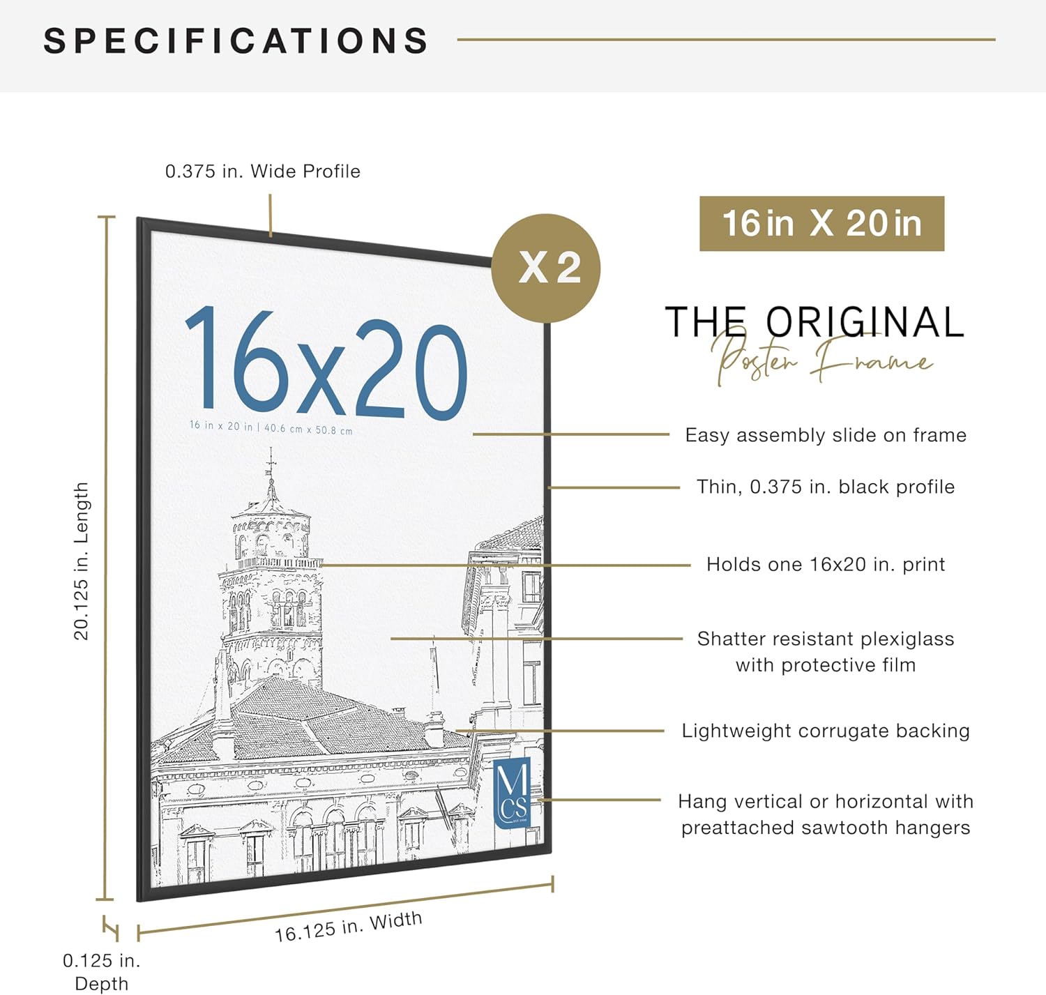 MCS Original Poster Frame 16x20 Black Lightweight Vertical & Horizontal Wall Hanging Large Picture Frame for Posters, Art Prints & Gallery Wall (2-Pack)