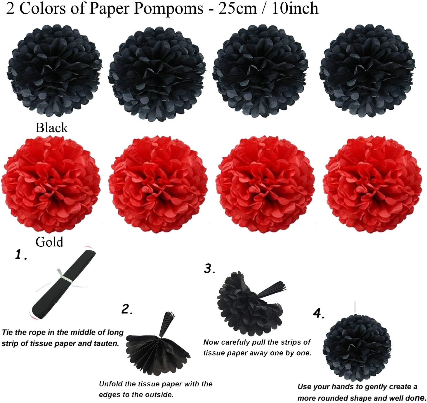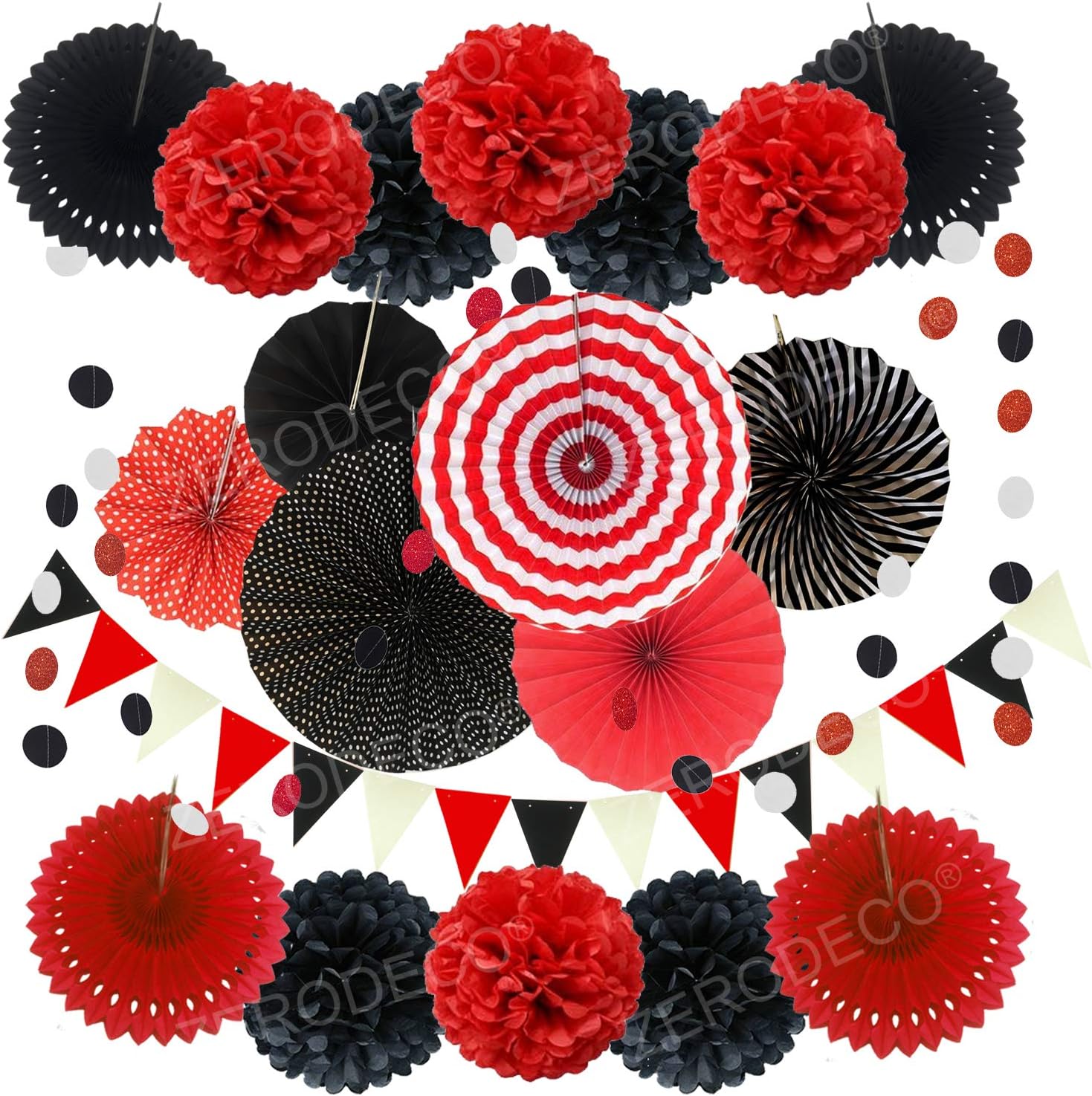 - Includes: 1 x 6.5ft Triangular pennants, 8 x 10inch/25cm Paper pompoms, 6 x 10inch/25cm Paper fans, 4 x Paper hollow fans, 2 x 6.5ft Circle Paper Garland. ( Color: Black, Red and White)