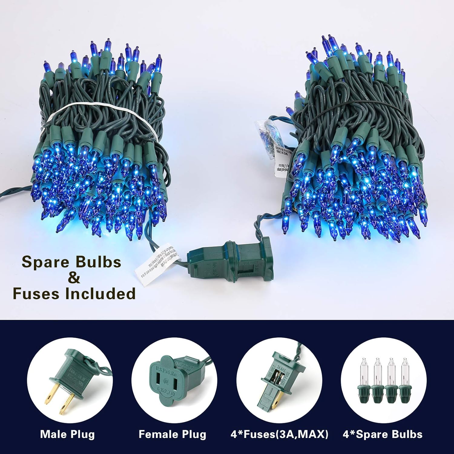 - Incandescent Blue Christmas Lights: 150 counts per string with bulb space 2.76in, 2.5V and 0.43W per bulbs, built-in 3A fuse for safety use. Extra bulbs and fuses included.