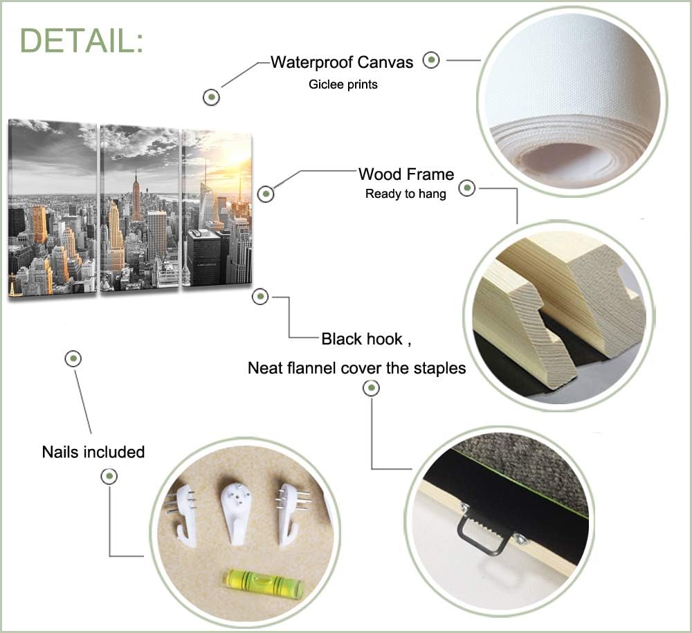 - Each panel canvas art has a black hook already mounted on the wooden bar ready to hang out of box