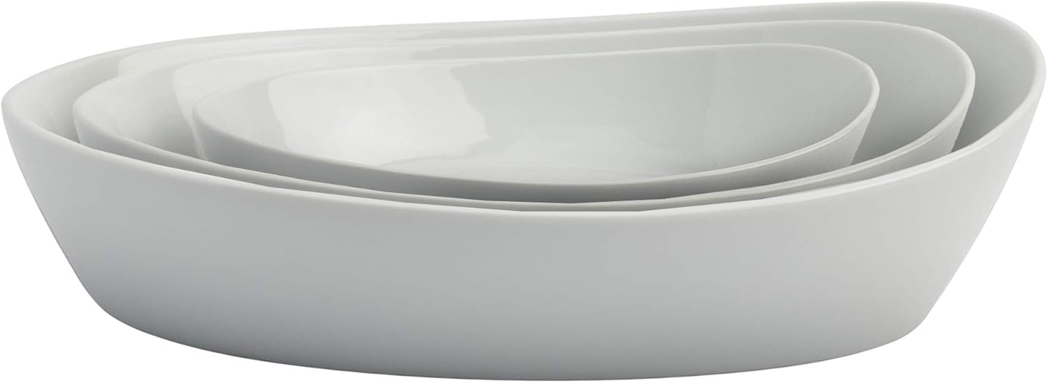- CLASSIC WHITE It's elegant curves and smooth glossy textured finished in a natural white provides a timeless look which will look great for years to come. This set comes as a set of 3 generously sized Oval shaped serving bowls; Small- 9"L x 6"W, Medium- 11"L x 7.4"W, and Large- 13"L x 8.75"W.