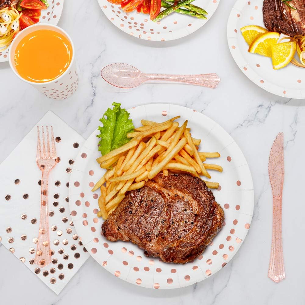 - SAVE TIME & ENJOY YOUR PARTY: No one likes to clean up after a party, which is why we designed this disposable paper plate,cups and rose gold plastic flatware set! Thanks to the recycled paper, you can throw them away when you clean up after an event or party. Save time and effortless. Let's spend more time with our family or friends.