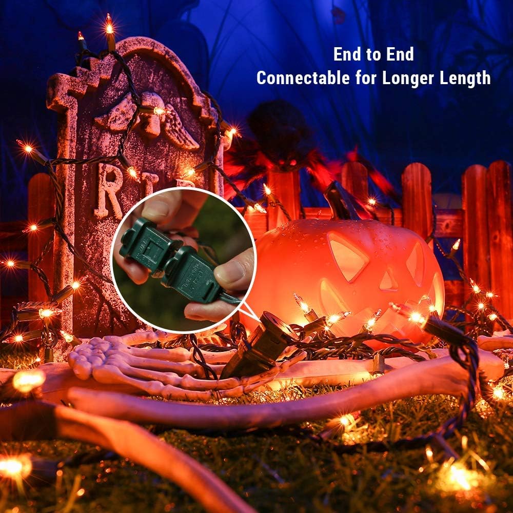 - End-to-End Connectable Orange Halloween String Lights: This mini orange light set is end to end connectable up to 3 sets (450 lights), expandable up to a longer 104.4ft length for any big project or small. UL certified, great value and quality, safety use. Orange tone, perfect for Halloween decoration.