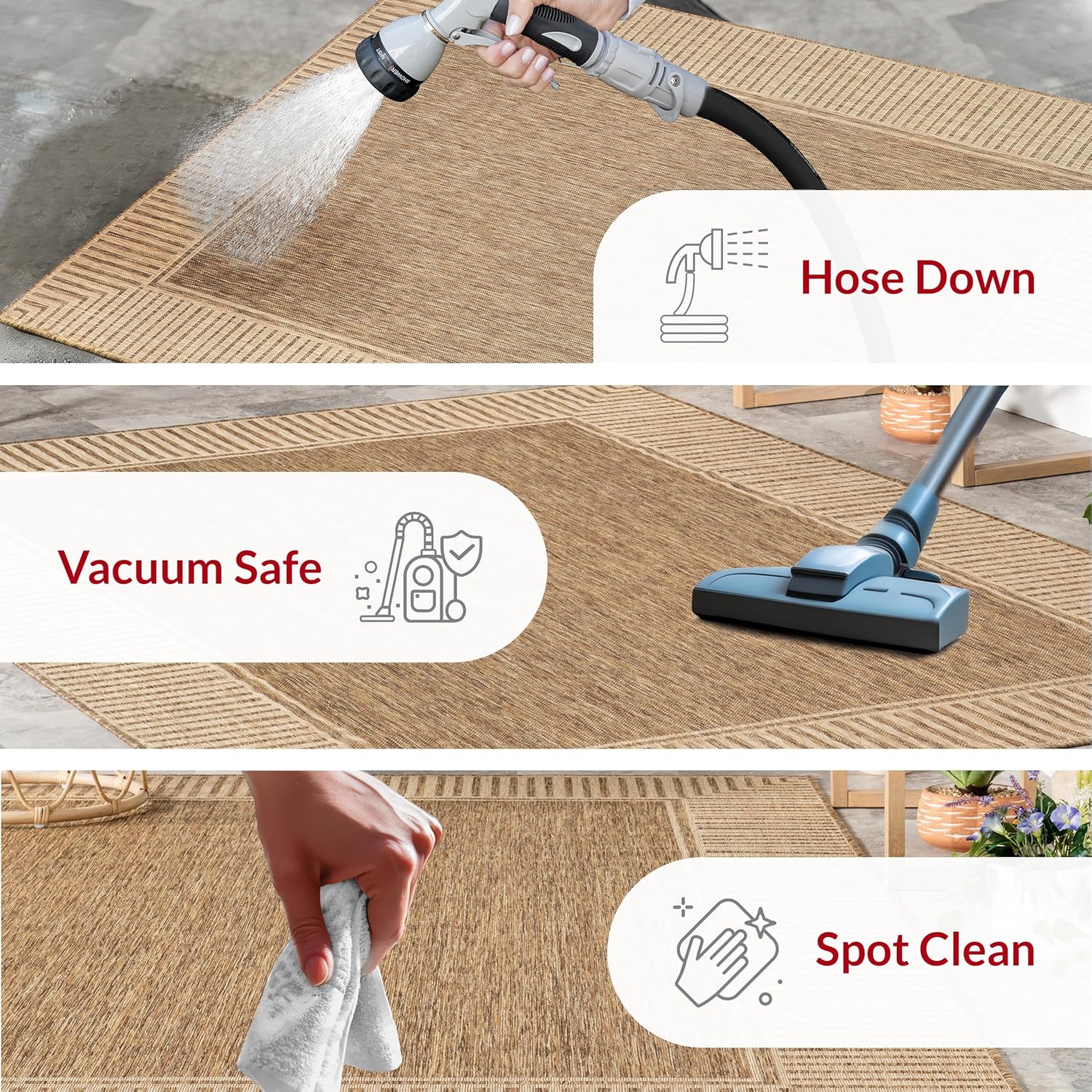 - Outdoor Rug Care Instructions: Easy to care for, simply shake out your outdoor rug to remove any light dirt or debris and spray your area rug with a hose for stubborn stains. This is the perfect patio rug or front porch rug to elevate your home.