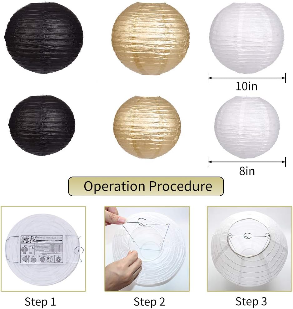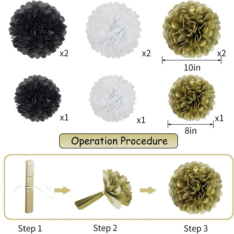- BLACK AND GOLD PARTY DECORATION SET INCLUDES: 1pc 8inch+1pc 10inch black paper lanterns, 1pc 8inch+1pc 10inch gold paper lanterns, 1pc 8inch+1pc 10inch white paper lanterns, 1pc 8inch+2pc 10inch black tissue pom poms, 1pc 8inch+2pc 10inch gold tissue pom poms, 1pc 8inch+2pc 10inch white tissue pom poms. Black, white and gold paper lanterns and paper pom pom decorations add a festive touch to any themed birthday party.