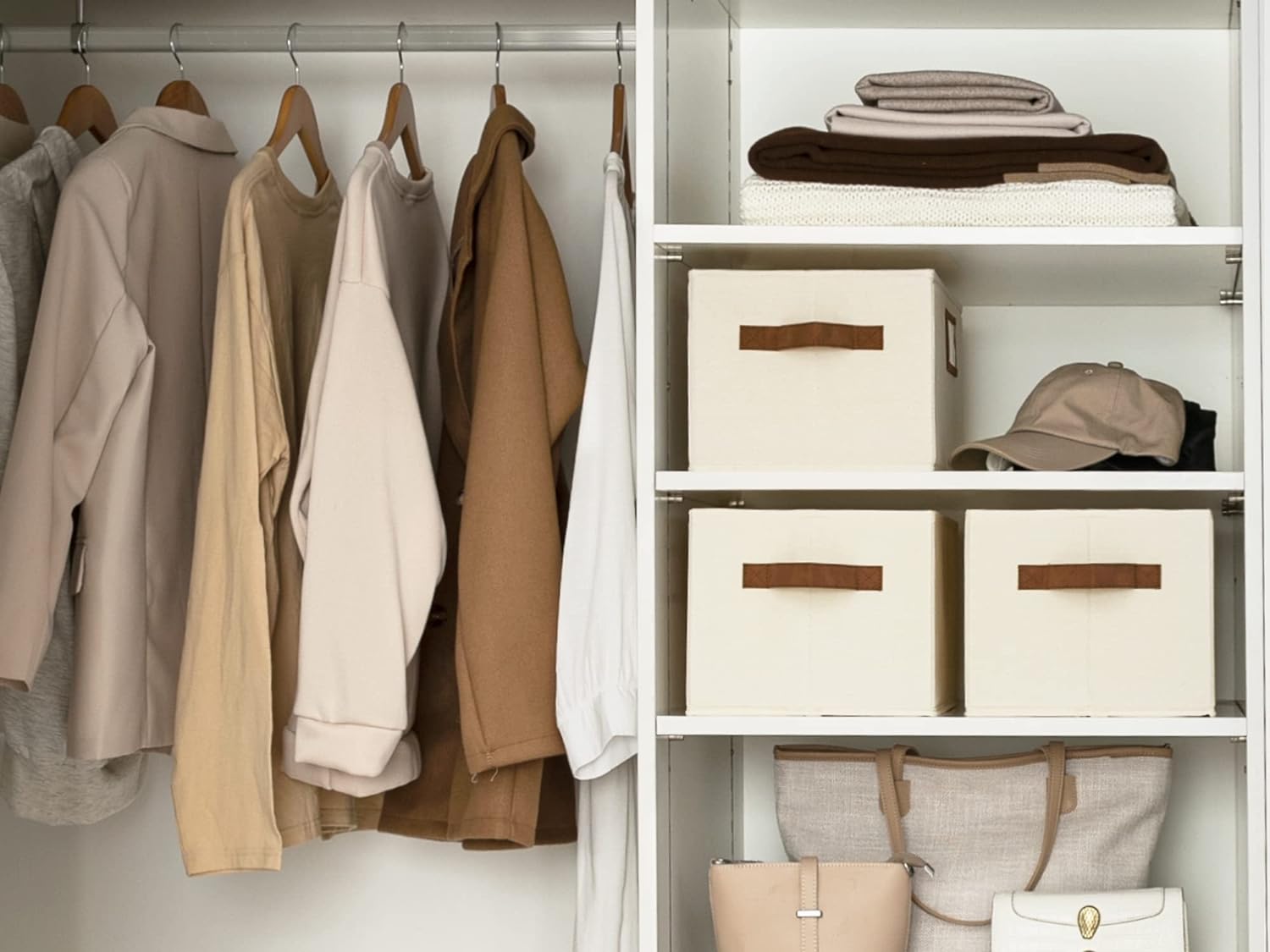 StorageWorks Storage Baskets for Shelves, Foldable Fabric Closet Storage Bins with PU Handles, Fabric Storage Bins Clothes Organizer, Ivory White, 3-Pack, Large