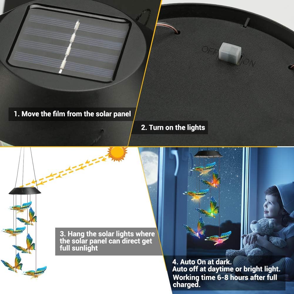 - 【Solar Powered Wind Chimes】 Featuring a unique design with 6 butterflies shaped lights charge automatically in the daytime and light up at night, free your hands, new version solar panel absorbs energy quickly, the solar Christmas lights can last up to 8-10 hours after fully charged.(Christmas Lights, Christmas Decorations, Easter Lights, Easter Decorations, Gift for Mom, Gifts for Wife, Gifts for Grandma, Mom Gift, Grandma Gift, Birthday Gift for Mom, Birthday Gift for Grandma)