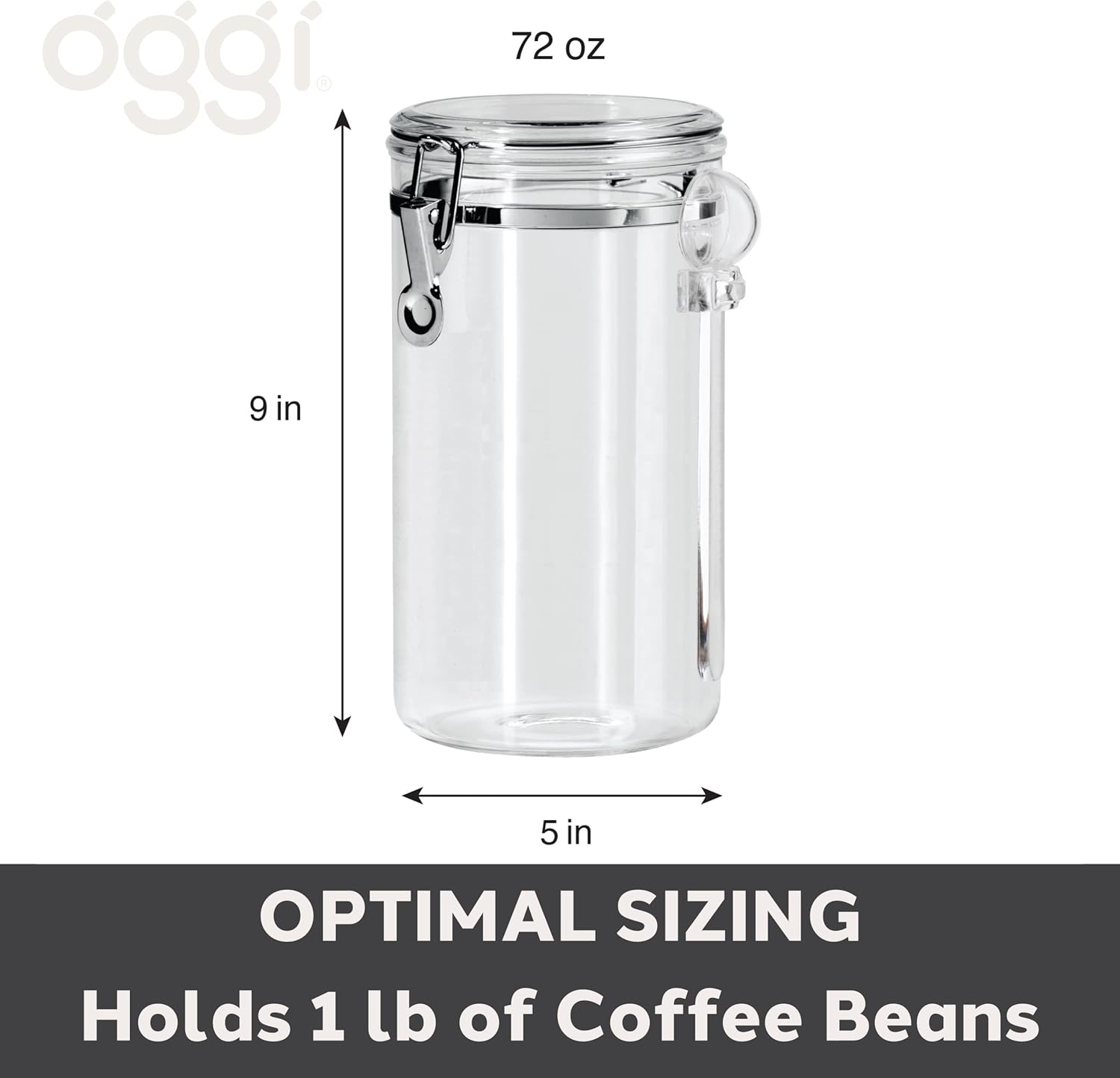 Oggi Clear Canister Airtight 72oz - Clamp Lid & Spoon - Airtight Food Storage Container, for Kitchen & Pantry Storage of Bulk, Dry Foods, Pasta, Flour, Sugar, Coffee, Rice, Tea, Spices & Herbs