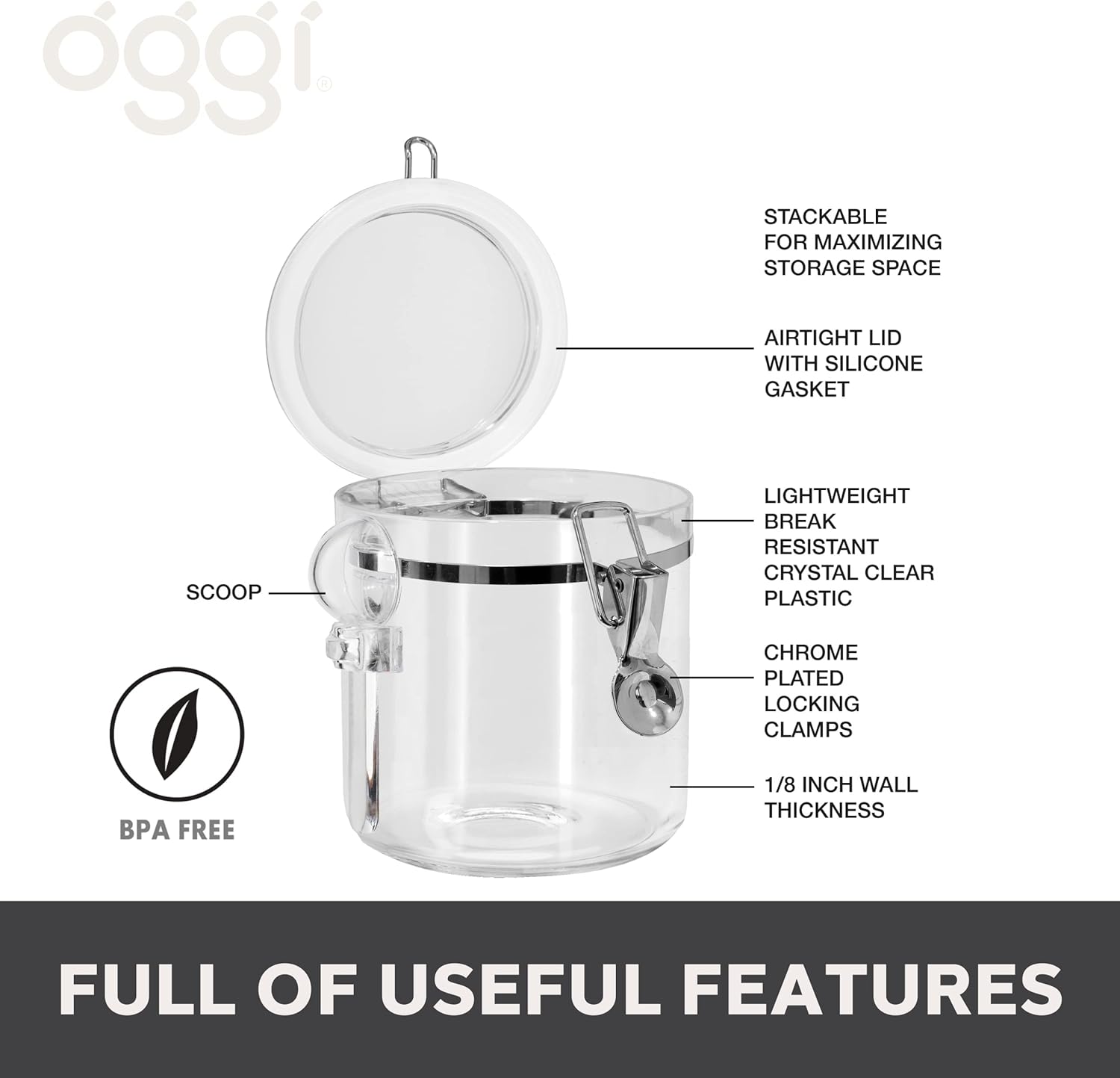 OGGI Clear Canister Airtight 38oz - Clamp Lid & Spoon - Airtight Food Storage Containers, Ideal for Kitchen & Pantry Storage of Bulk, Dry Food Including Flour, Sugar, Coffee, Rice, Tea, Spices & Herbs