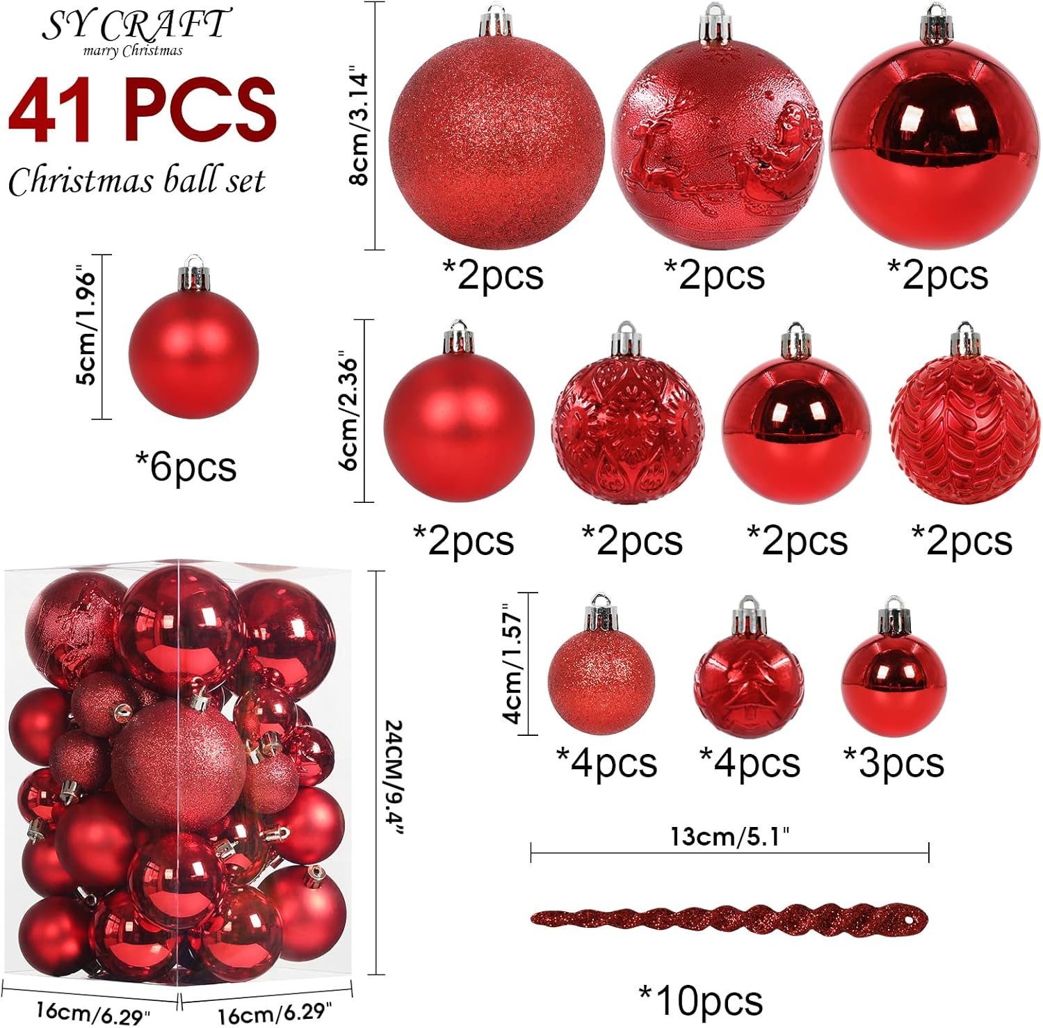 41PCS Christmas Ball Ornaments for Christmas Tree Decorations, Xmas Tree Red Shatterproof Ball Ornaments with Hanging Loop for Holiday and Party Decoration