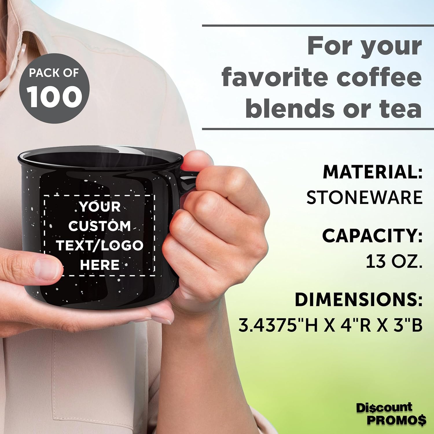 DISCOUNT PROMOS Custom Ceramic Campfire Coffee Mugs 13 oz. Set of 100, Personalized Bulk Pack - Perfect for Tea, Espresso, Cappuccino, Hot Cocoa - Black