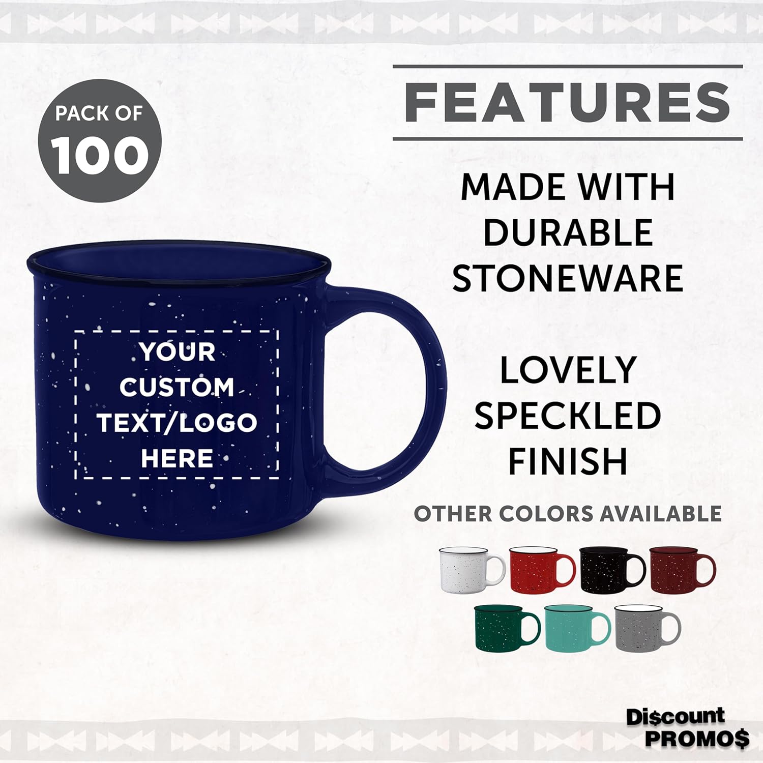 DISCOUNT PROMOS Custom Ceramic Campfire Coffee Mugs 13 oz. Set of 100, Personalized Bulk Pack - Perfect for Tea, Espresso, Cappuccino, Hot Cocoa - Blue