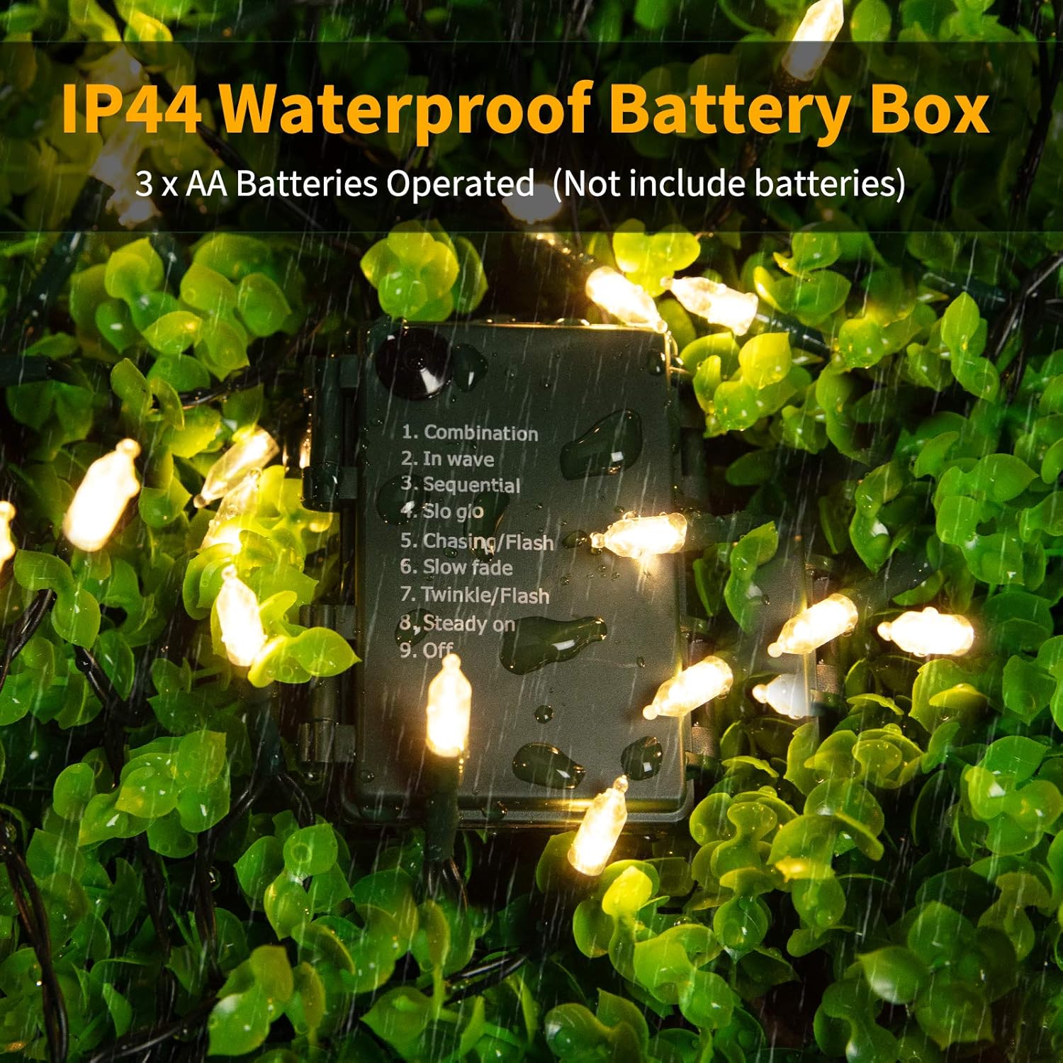 - 【Manual operation】There is 8 various fantastic lighting effects adapting to desired occasions or events: press the button on control box repeatedly to select 1.combination, 2.in wave, 3.sequential, 4.slow glow, 5.chasing or flash, 6.slow fade, 7.twinkle or flash or 8.steady on