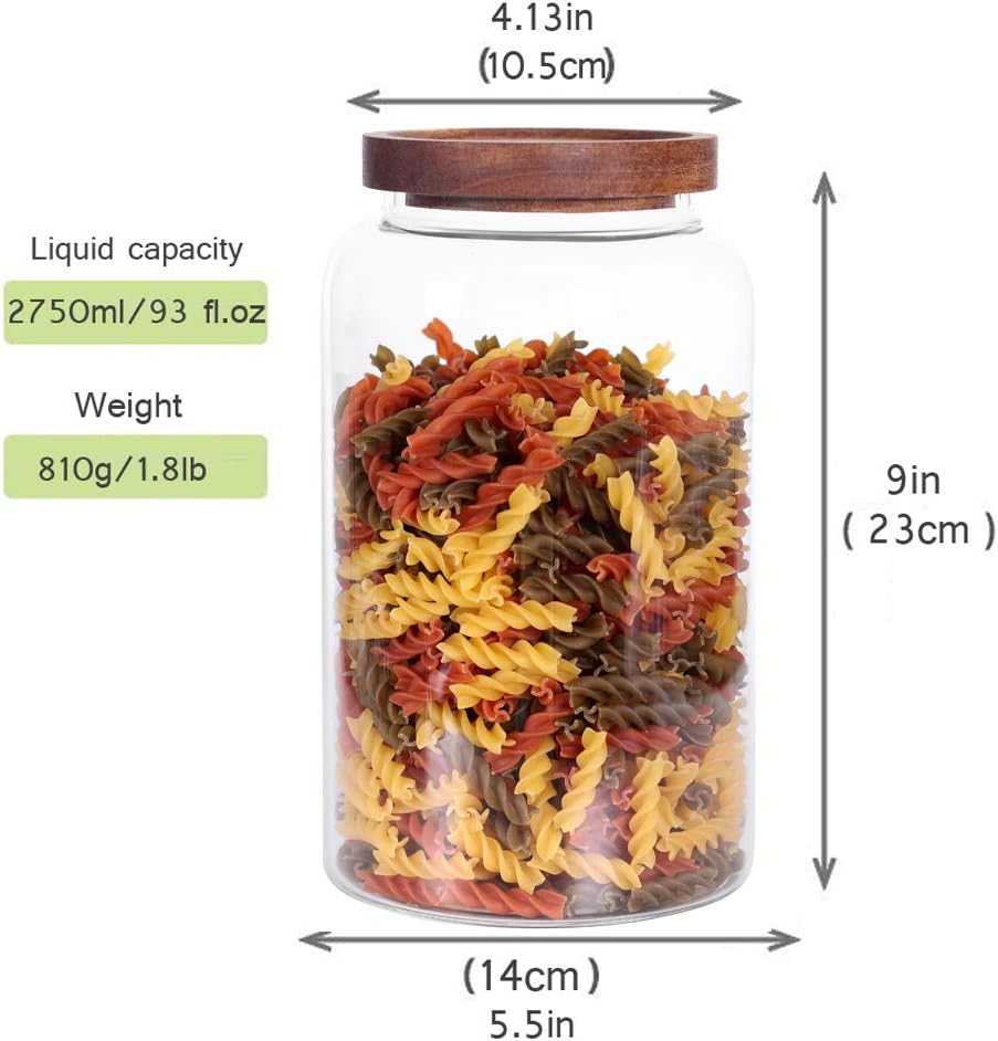 Large Glass Jar with Airtight Lid Set of 2 93 FL OZ(2750ml) glass canister set, Glass Food Containers Wooden Lid Suit for Kitchen Pantry for Flour, Tea, Coffee Beans, Sugar, Cookies(8.8 inch high)