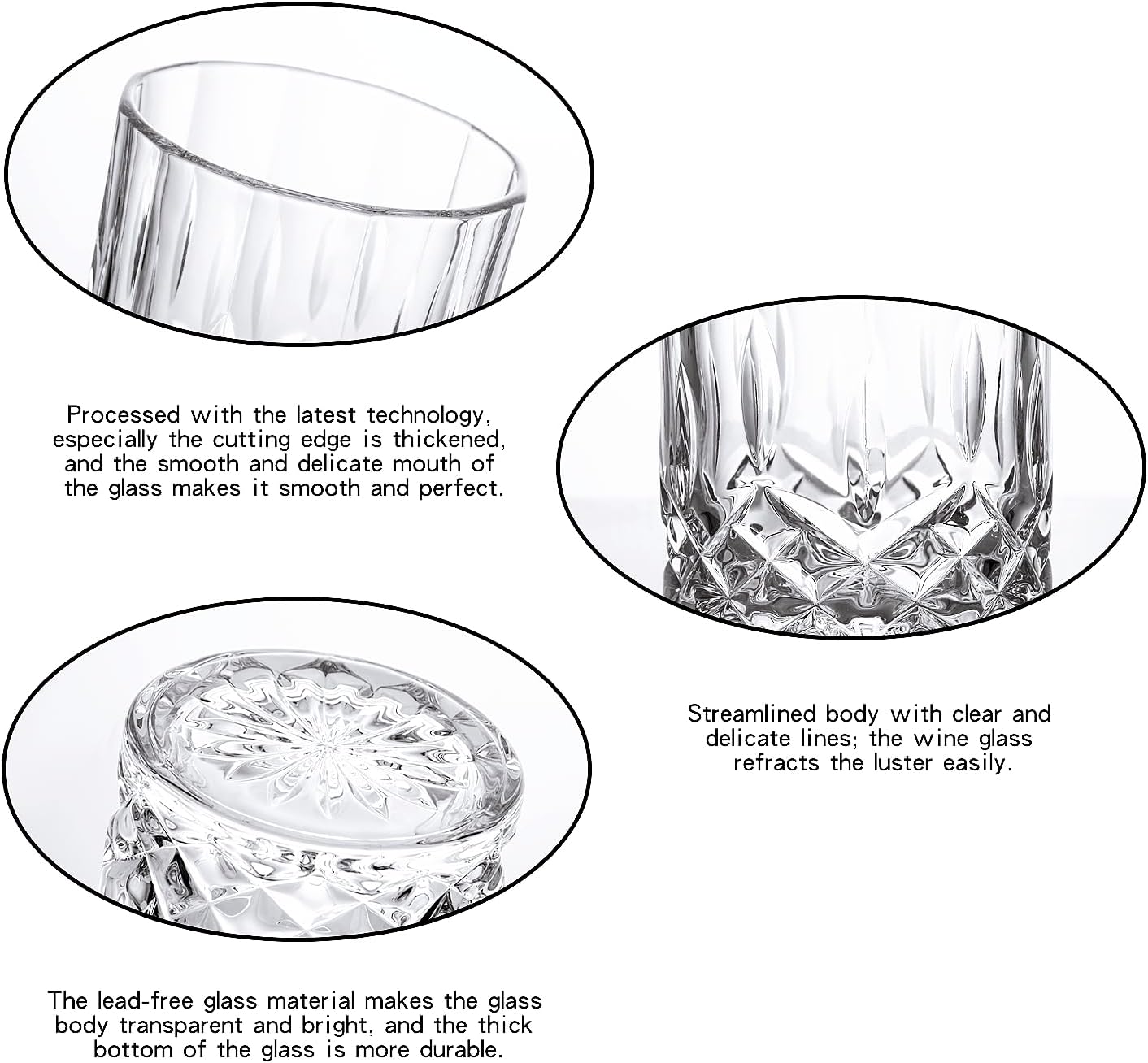 - 【Classic Whiskey Glass】All our crystal whiskey glasses feature uneven surfaces and high-quality craftsmanship, inspired by chrysanthemums, butterflies and sunlight. Transparent, shiny and elegant appearance gives it maximum clarity and brightness. The classic whiskey glass has an antique appearance and is of medium size. Whether it is a formal or informal occasion, it will look elegant, chic and cool.