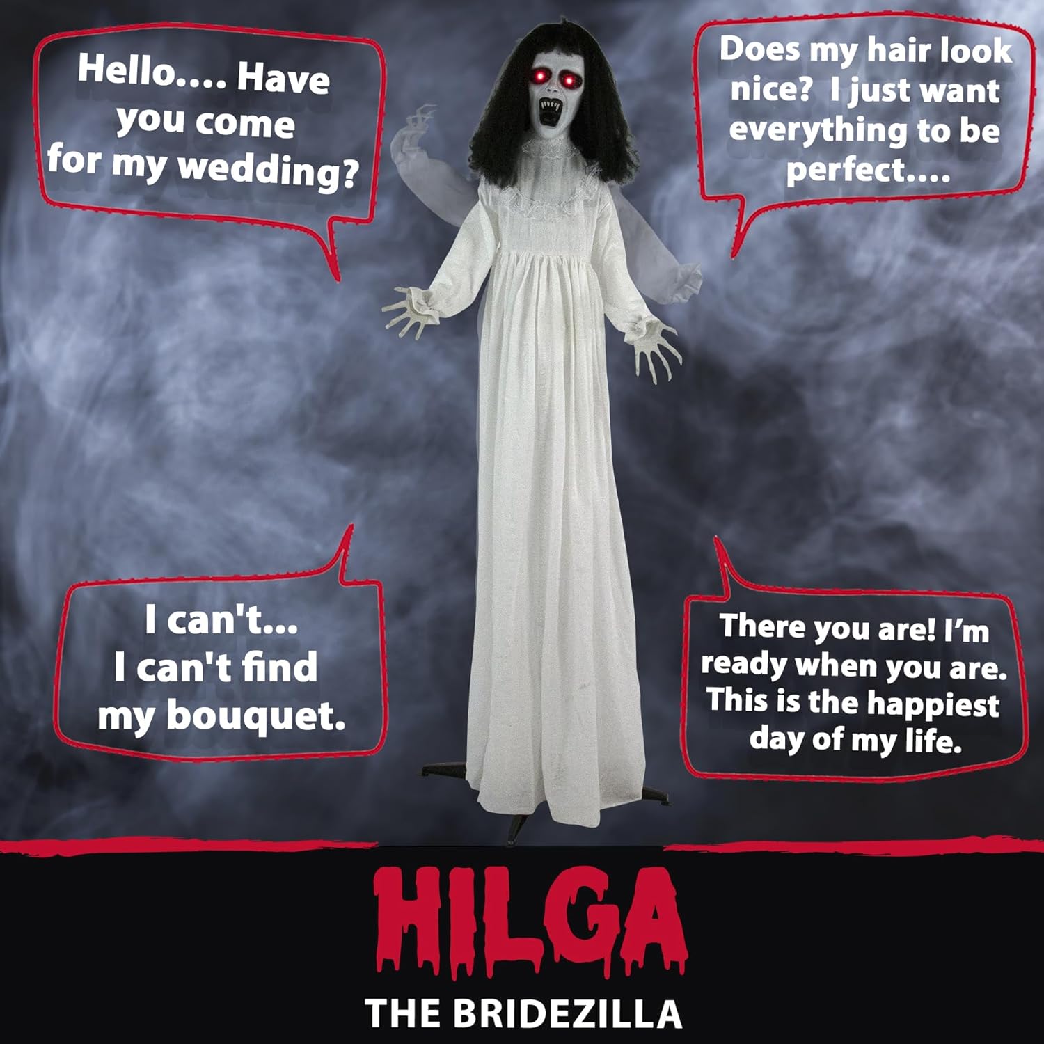 - Lights up and Moves: This bride's arms and head move when bumped while her eyes flash in red LED lights