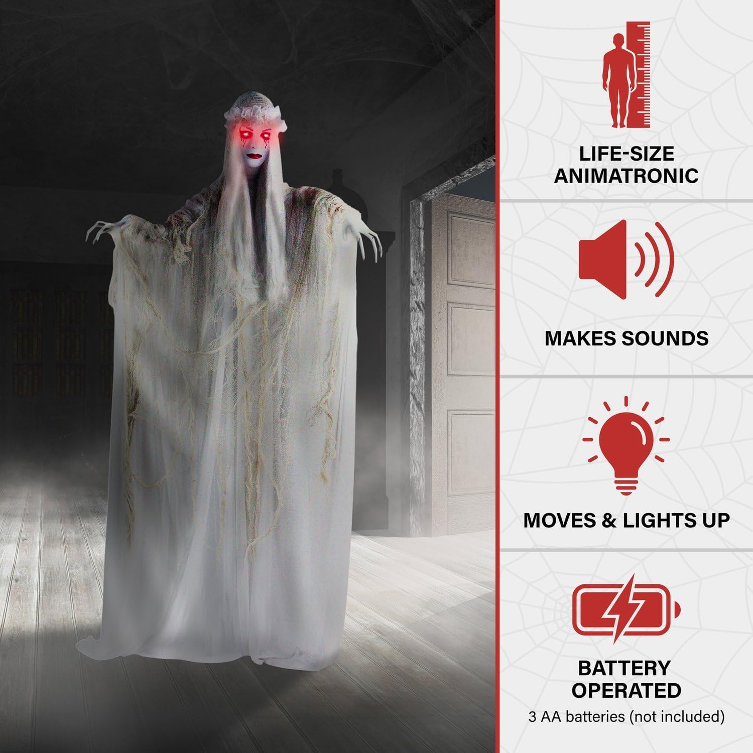 Haunted Hill Farm Life-Size Scary Ghost Bride, Halloween Animatronic with Touch Activated Lights and Sound, Battery Operated Indoor or Covered Outdoor Halloween Decorations, Creepy Halloween Prop