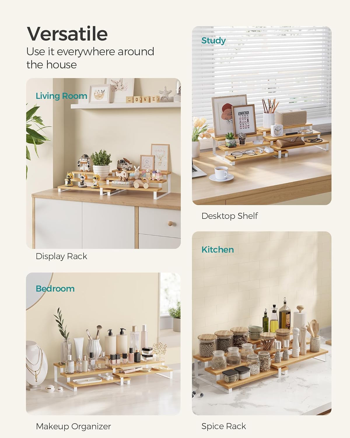 - 【VERSATILE】This 3-tier spice shelf is perfect for home use or store displays. Use it on countertops, dining tables, vanities, or in cabinets for showcasing condiments, desserts, perfumes, cosmetics, or collectibles