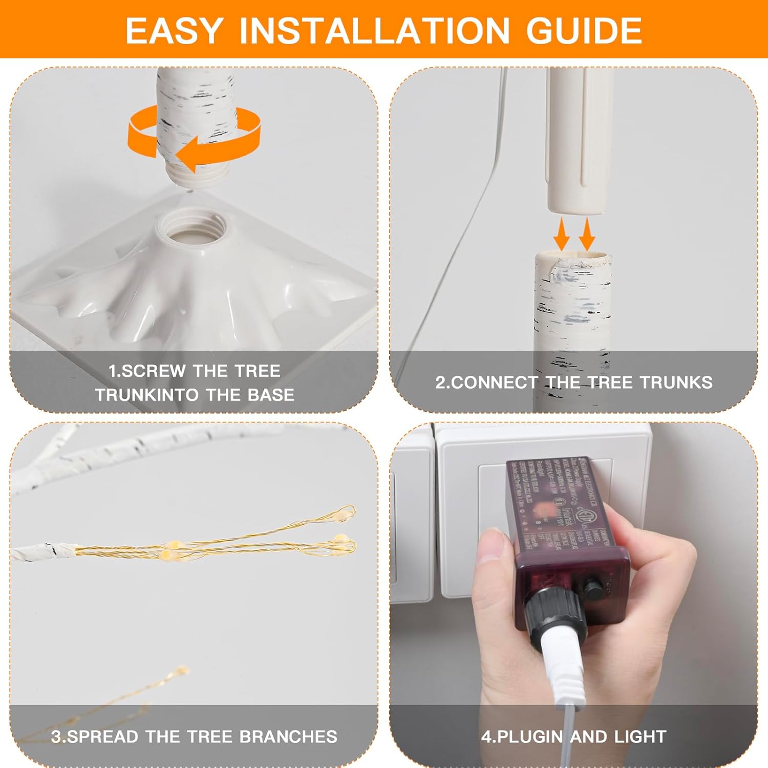 - 【High Quality & Easy to Assemble】The trunk and branches are strong enough, the square frame base is stable, easy to move and reusable. Energy efficient and long lasting, in good condition for many years. Take out the tree stand, put the trunk into the tree and tighten it, insert the top of the trunk into the bottom of the trunk and tighten. Extra long power cord, adapter included in package.