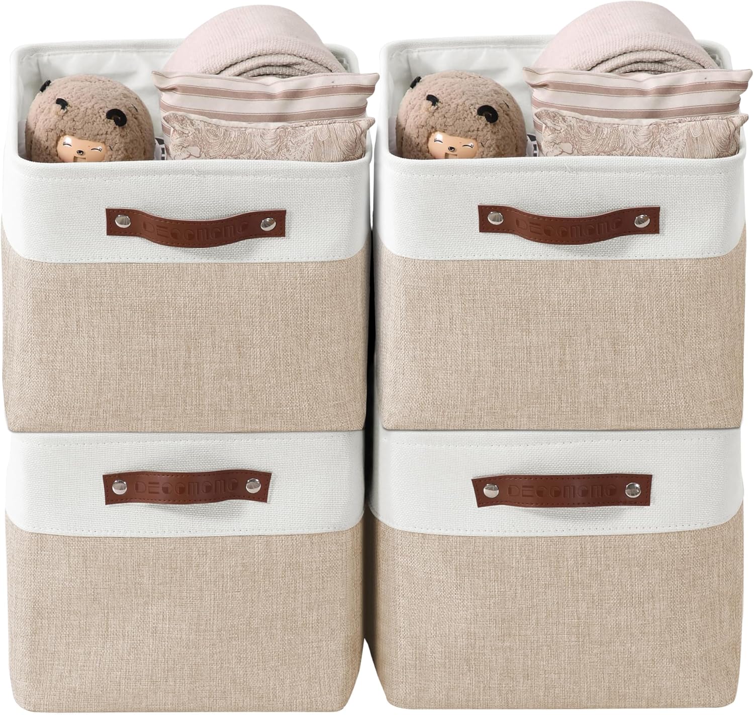 DECOMOMO Storage Bins Fabric Storage Baskets for Shelves, Linen Closet Organization Toys Nursery (Beige and White, Large - 4 Pack)