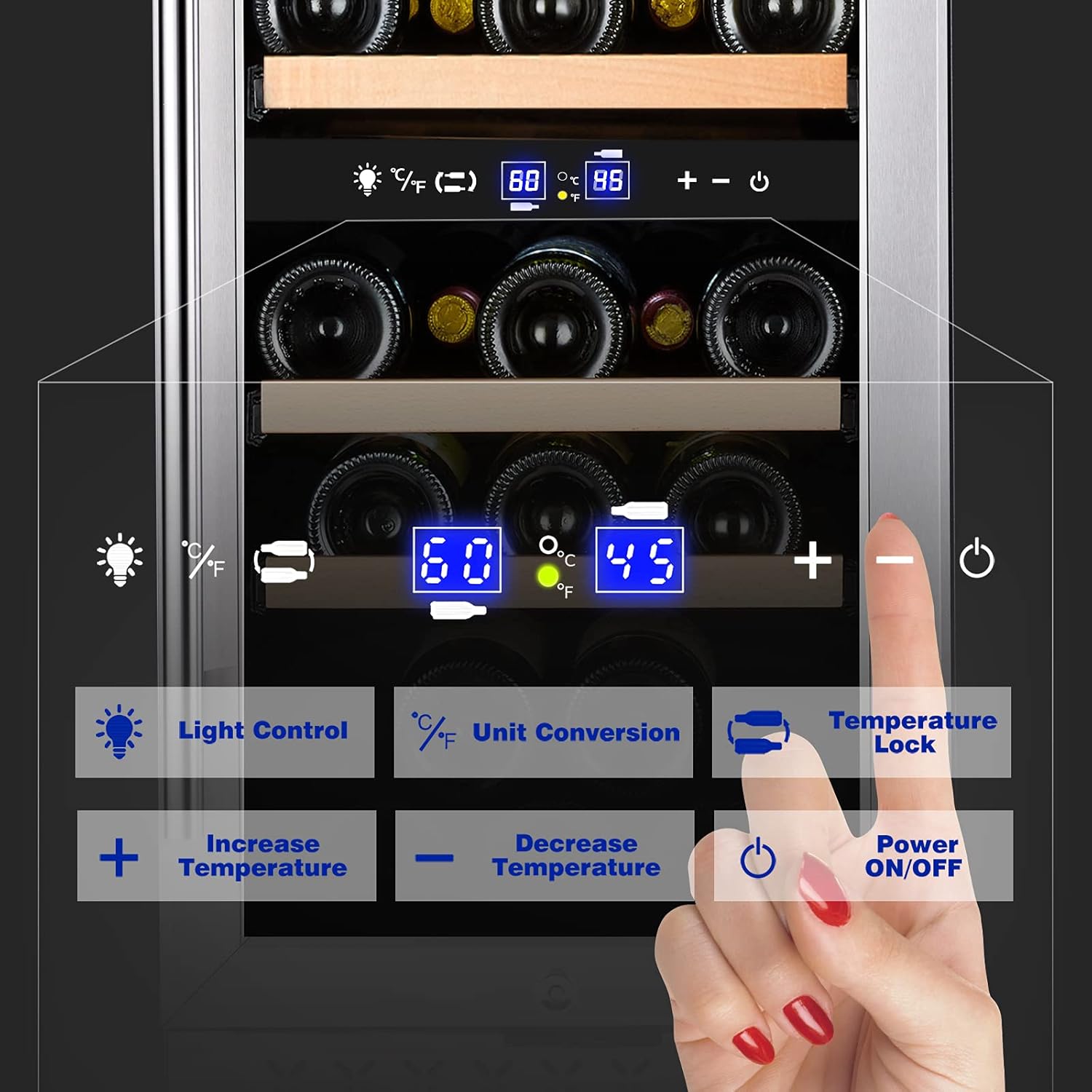 - 🍸【Easy to Use & Smart】Smart temperature memory function enables the refrigerator to restore to the temperature history you set last time when restarted if there occurred with power-off. The dual zone wine cooler adopts a digital control system that is easy to operate. There are two settings for LED light time. It can be set to light out after 10 minutes, or it set to keep on light. It is convenient to find the wine in dark. A safety lock comes with 2 keys to protect your worthy collection.