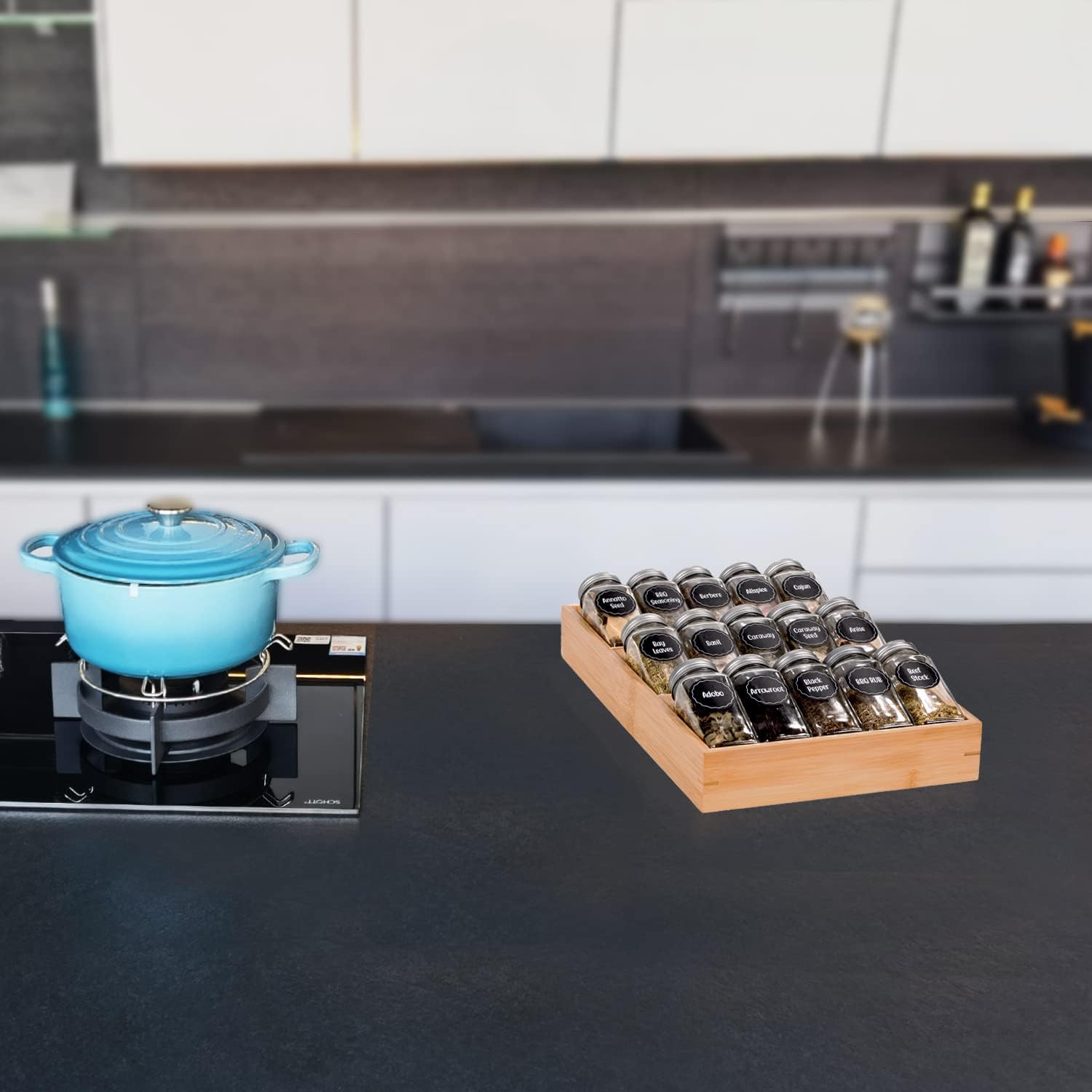 - 🌴More Use: Suitable for spice bottles & jars, drink, sauces, jelly jars, vitamin and medicine bottles. The bamboo spice rack also can organize essential oils, cosmetics, lipstick, nail polish and perfumes.