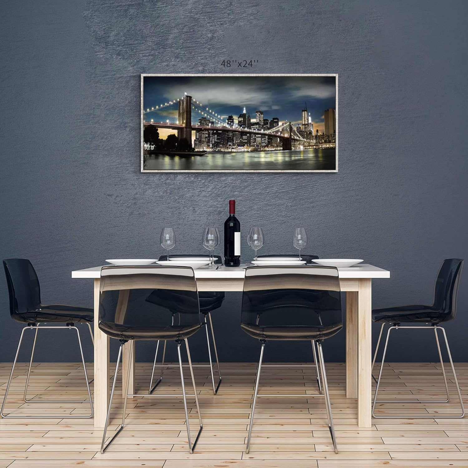 Framed Brooklyn Bridge Wall Art: Large Size New York Cityscape Skylines Night Scene Modern Picture Artwork for Home Office Decoration (48” X 24”)