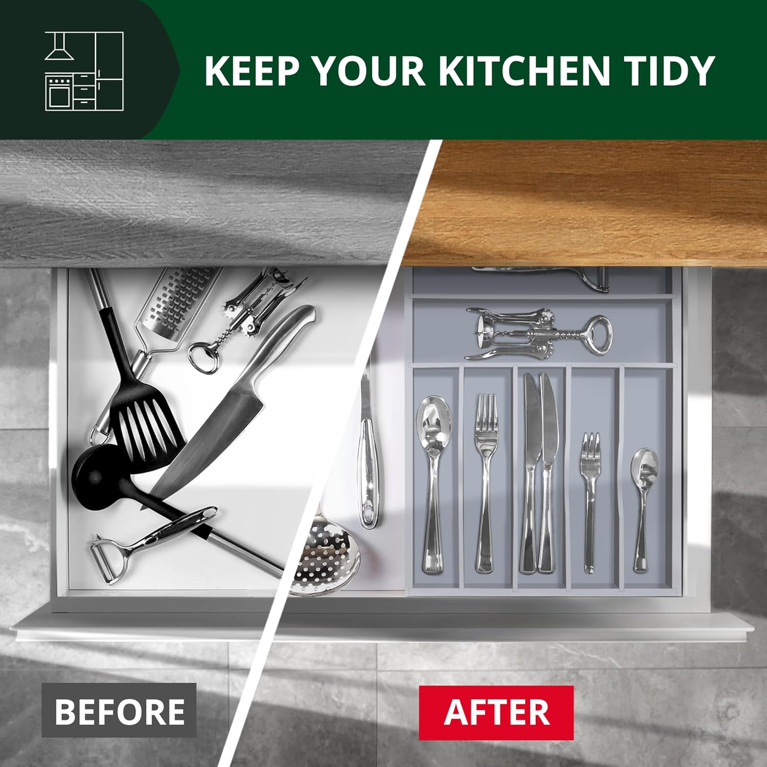 - 🧽𝐄𝐀𝐒𝐘 𝐓𝐎 𝐔𝐒𝐄, 𝐋𝐎𝐖 𝐌𝐀𝐈𝐍𝐓𝐄𝐍𝐀𝐍𝐂𝐄: Super easy to use, simply set the Royal Craft Wood Cutlery Tray with Drawer Organizers in your clean, empty drawer and fill with anything you’d like from kitchen utensils such as spoons, forks, tongs, spatulas, or steak knives to desk essentials like your stapler and staple refills, paper clips, erasers, and more. Easy to maintain, all you need to do is wipe clean with just a damp cloth, and your silverware drawer organizer will be as good as new