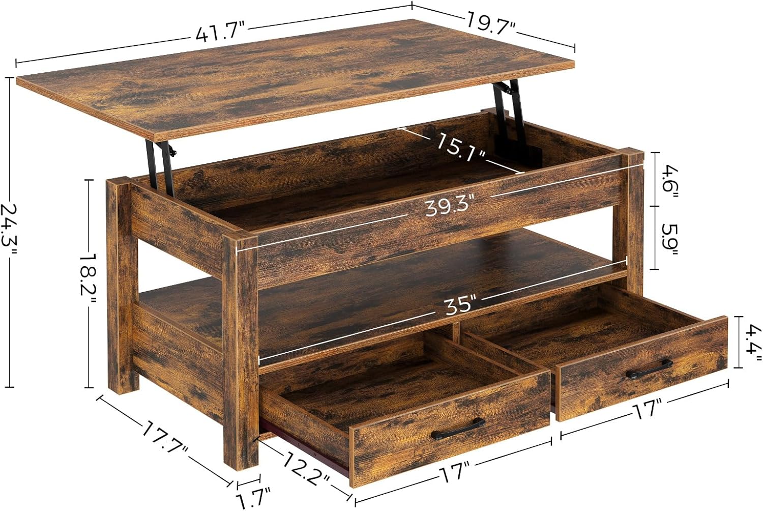 Rolanstar Coffee Table, Lift Top Coffee Table with Drawers and Hidden Compartment, Retro Central Table with Wooden Lift Tabletop, for Living Room,Rustic Brown