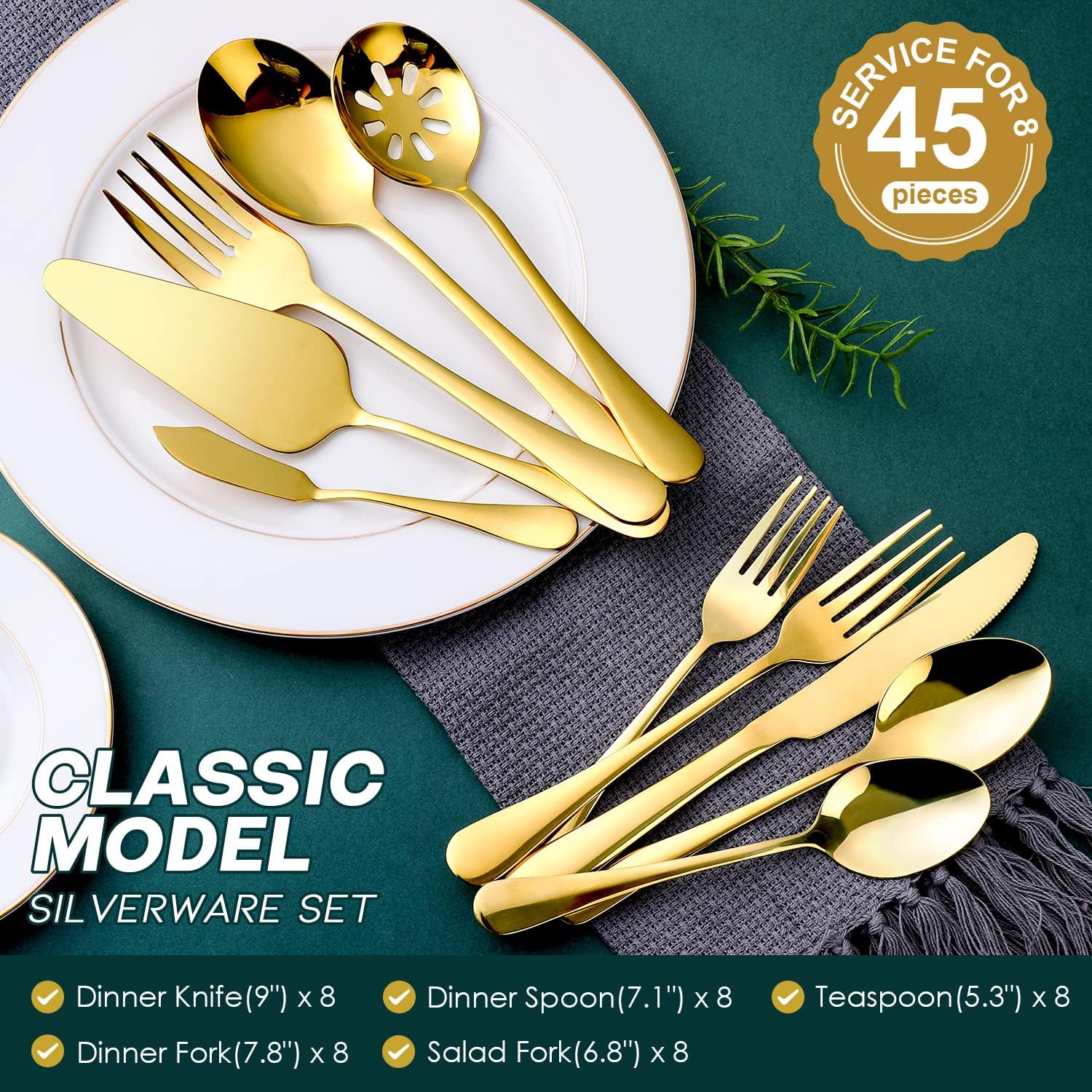 - 【45 PIECES GOLD SILVERWARE SET FOR 8】OGORI 45-piece gold silverware set includes 8 dinner knives, 8 dinner forks, 8 dinner spoons, 8 tea spoons, 8 salad forks and 5-piece nice serving set ( 1 serving spoon, 1 serving fork, 1 pie server, 1 butter knife, 1 slotted serving spoon)