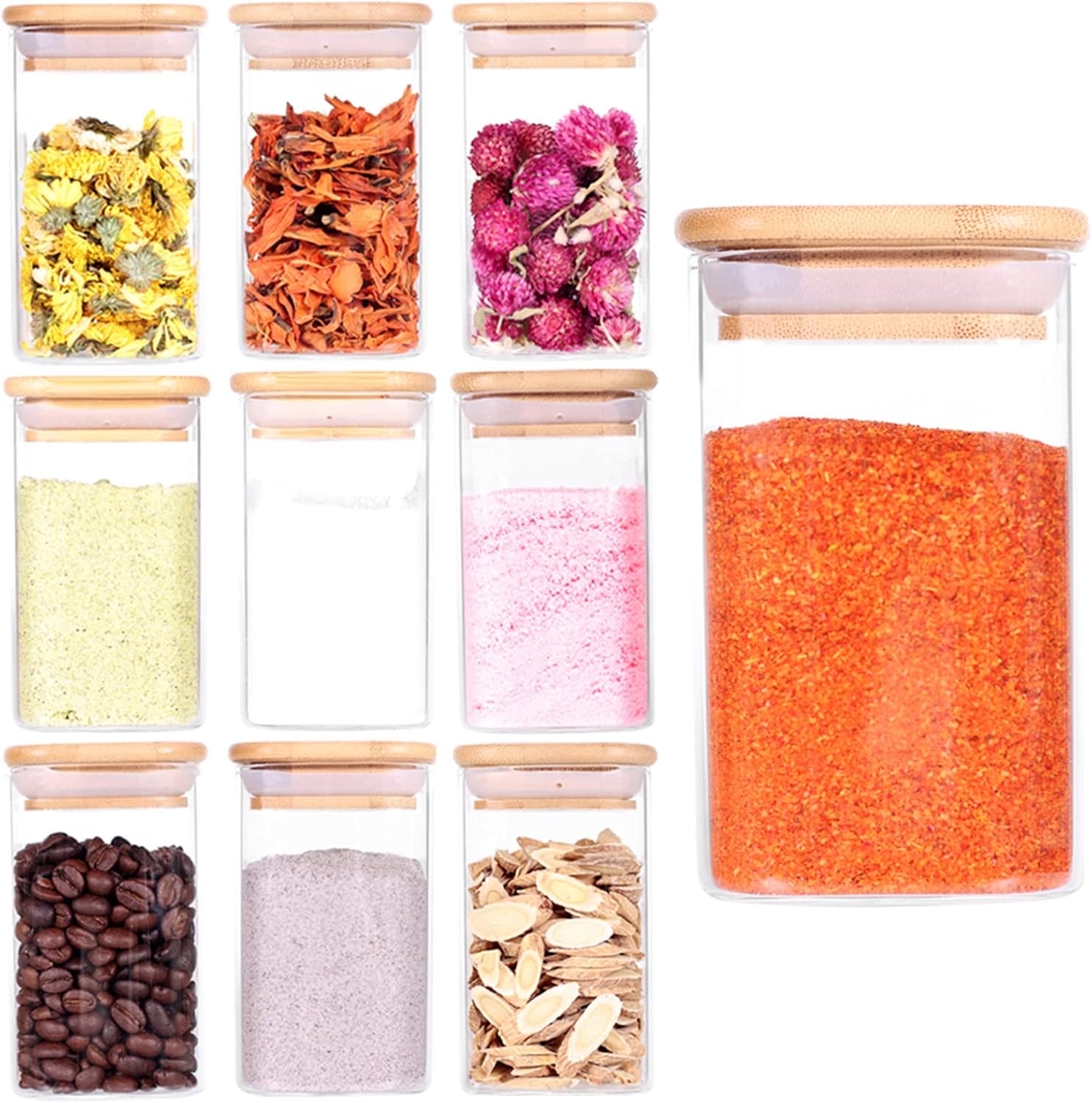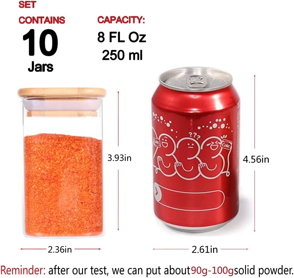 10 Pcs Glass Spice Jars - 8oz Empty Square Spice Storage Containers With Bamboo Airtight Lid and Labels - Thicken Small Glass canister for Kitchen Seasoning,Coffee Bean,Tea,Suger,Herbs