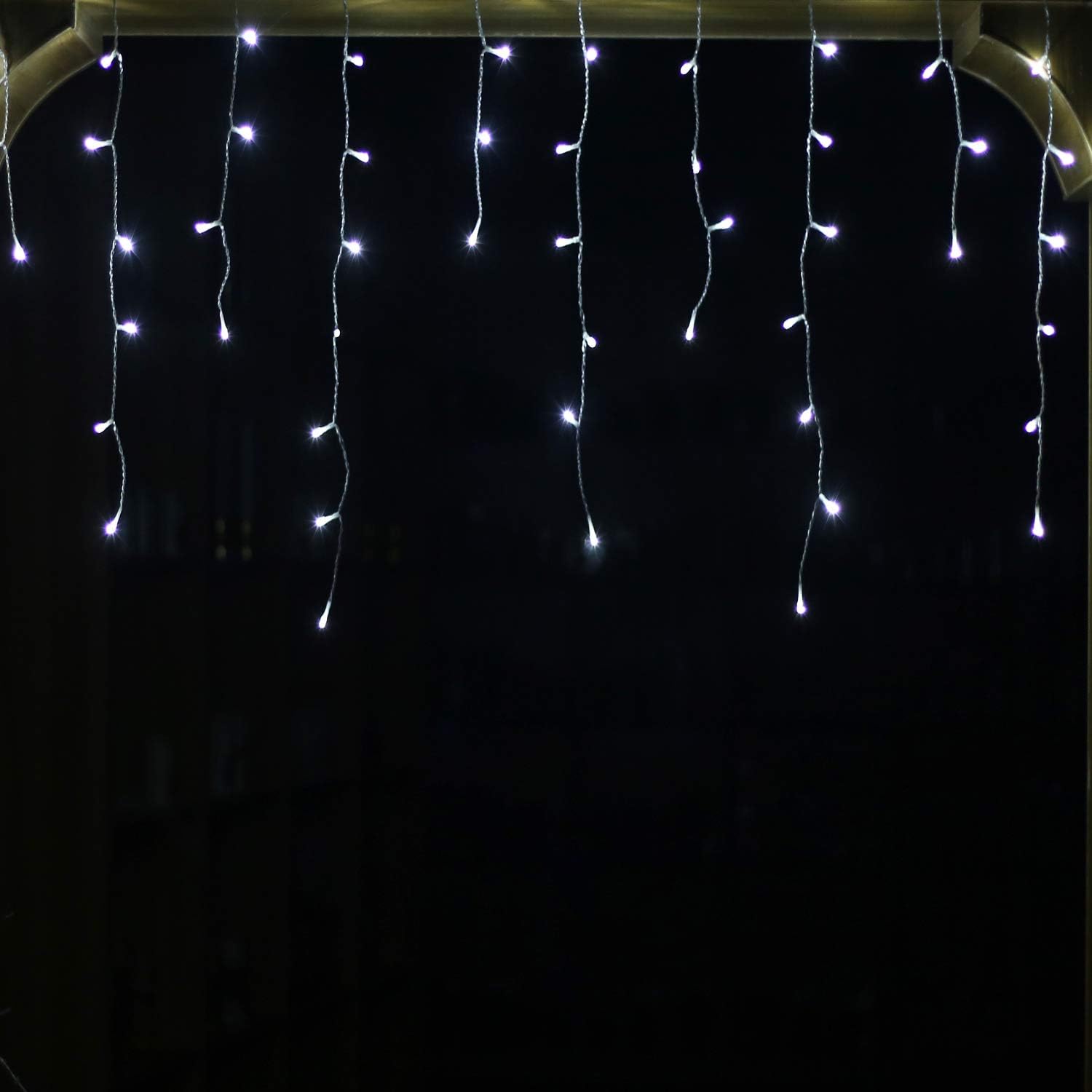 - Cool white 300Led Icicle lights,Icicle Style String Lights on white cable with 60 drops, display Horizontal Length:29.5ft / 9meters, LED Spacing: 3.9in / 10cm,3 meter Independent extension cord.