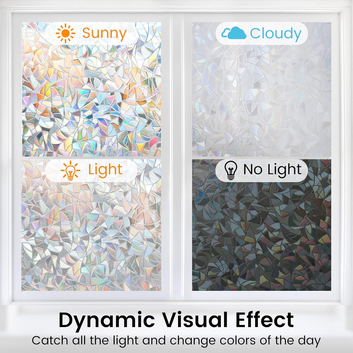 - Rainbow Effect: Crafted by 3D laser process, this rainbow prism window film will catch the light and create a rainbow effect when the sun hits the decal. The decorative window cling itself does not actually have any color, and the rainbow effect depends on the angle and intensity of the sunlight. Also, it classes up the room and makes the window look like stained glass without the expense of a custom stained glass window