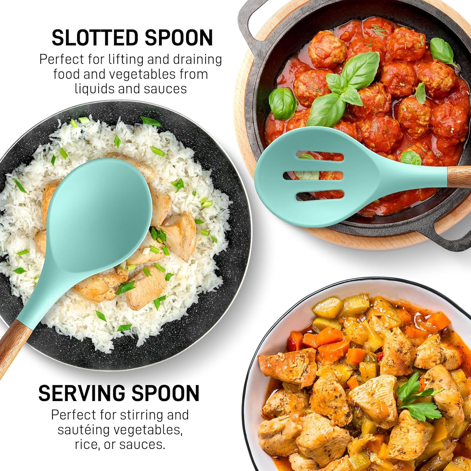 - Excellent Quality: Crafted from the best quality materials meant to last you a lifetime. Food-grade silicone heads can resist up to 464 F and won’t melt. The handles are crafted from authentic acacia hardwood that is known to last up to 40 years. Each utensil provides a perfect balanced weight and elegant design that will spruce up your kitchen décor.